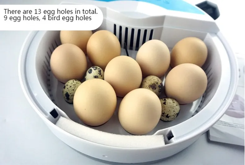Емкость: 9 куриных яиц, 9 птичьих яиц, 4 утиных или Перепелиных яиц, 13 птичьих яиц