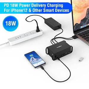 【 Power ed Hub с 18 Вт USB C PD для iPhone12 и smartphone】 с независимым адаптером переменного тока для ноутбука 96 Вт, все порты док-станции имеют максимальный источник питания, обеспечивает стабильную производительность (питание MacBook Pro/Air на полной скорости); Доставка энергии на 18 Вт USB-C порт обеспечивает супер быструю зарядку вашего телефона, Не покупайте дополнительное настенное зарядное устройство для iPhone ..