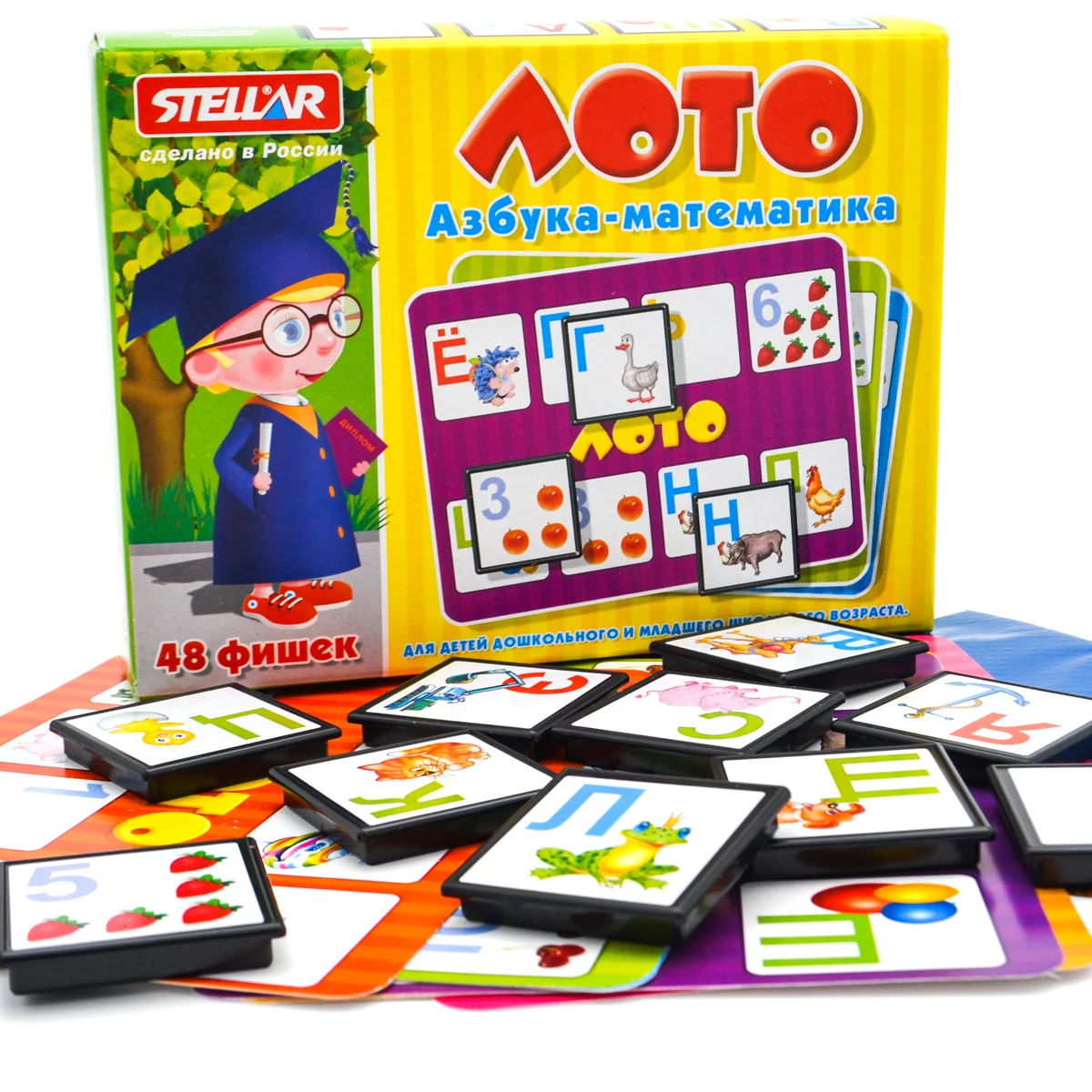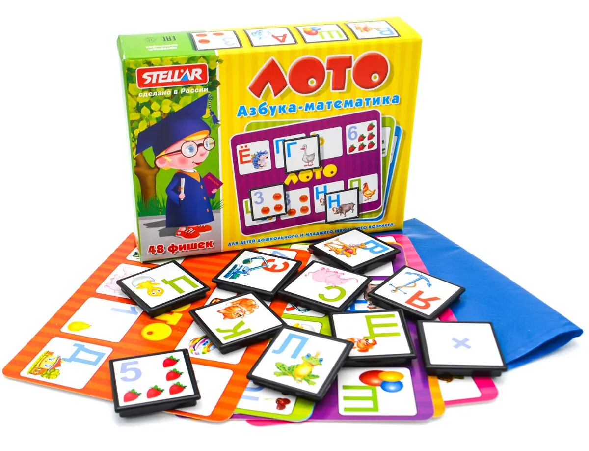 Лото «Азбука-математика» позволит ненавязчиво знакомить малыша с цифрами и буквами.