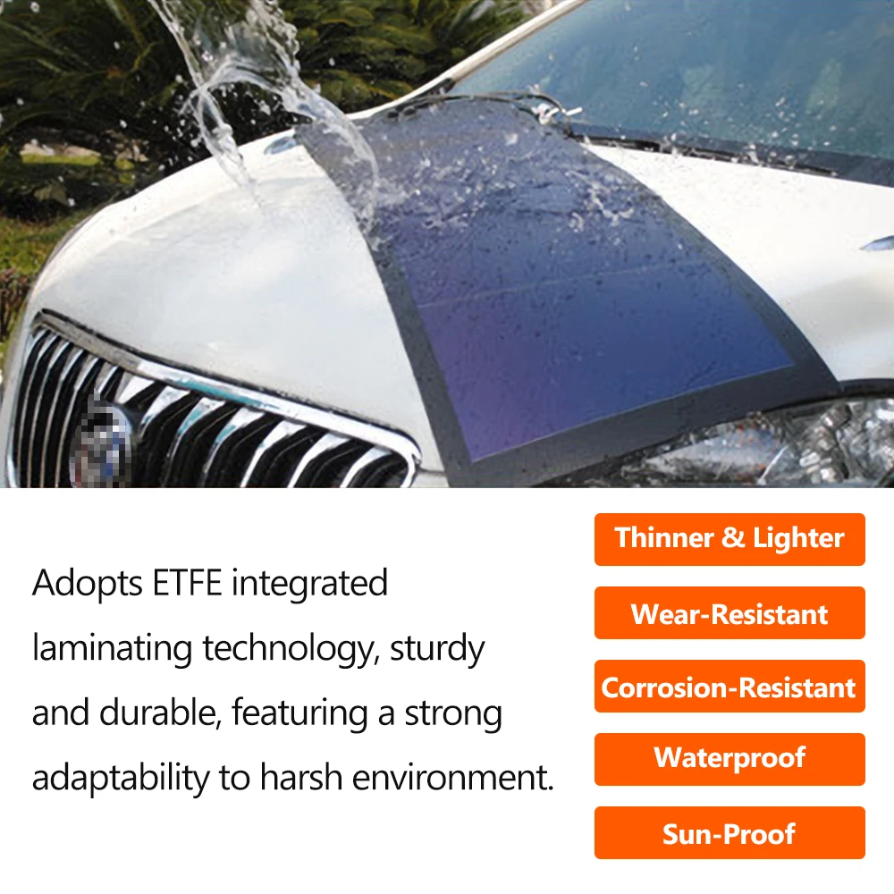 Принимает интегрированную технологию ламинирования ETFE и Аморфную силиконовую гибкую тонкую пленку солнечных элементов, эта гибкая тонкопленочная солнечная панель обладает сильной адаптируемостью к суровым условиям, и ее можно приклеивать непосредственно на крышу, чтобы обеспечить питание для электроприборов транспортного средства и добиться подзарядки для обычных автомобилей, электрических трехколесных велосипедов, большие электромобили, грузовики, Салон автомобилей и так далее. Просто попробуйте!