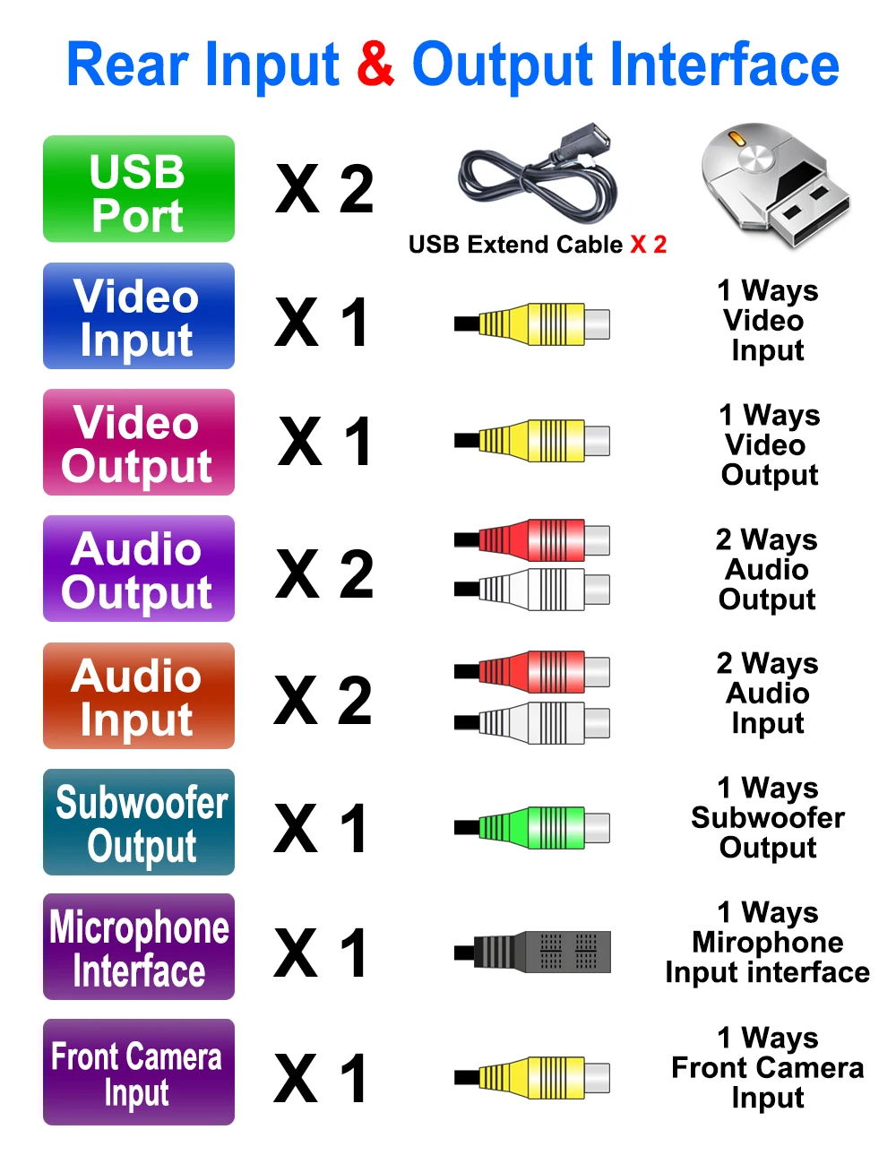 1 выход видео/1 выход видео/2 выхода аудио/2 выхода аудио/1 выход сабвуфера/1 выход mirophone входной интерфейс/1 вход фронтальной камеры