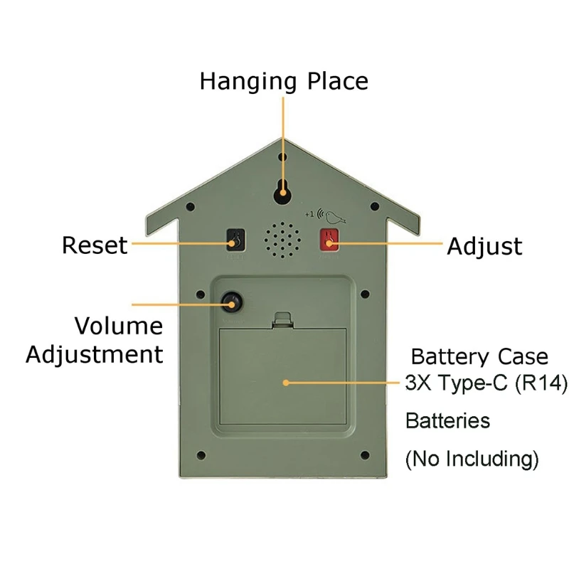 ● Окно автоматически открывается ежечасно, cuckoo будет прыгать и говорить «Cuckoo» в то же время, после окончания времени отчета, cuckoo возвращается, окно закрывается. (Примечание: 1 час, милый, называемый «Cuco», как только крыло открывается один раз. Пример: В 5: 00 вечера милые пять звуков «Cuco» одновременно расширяют крылья пять раз.)