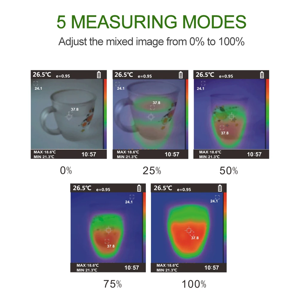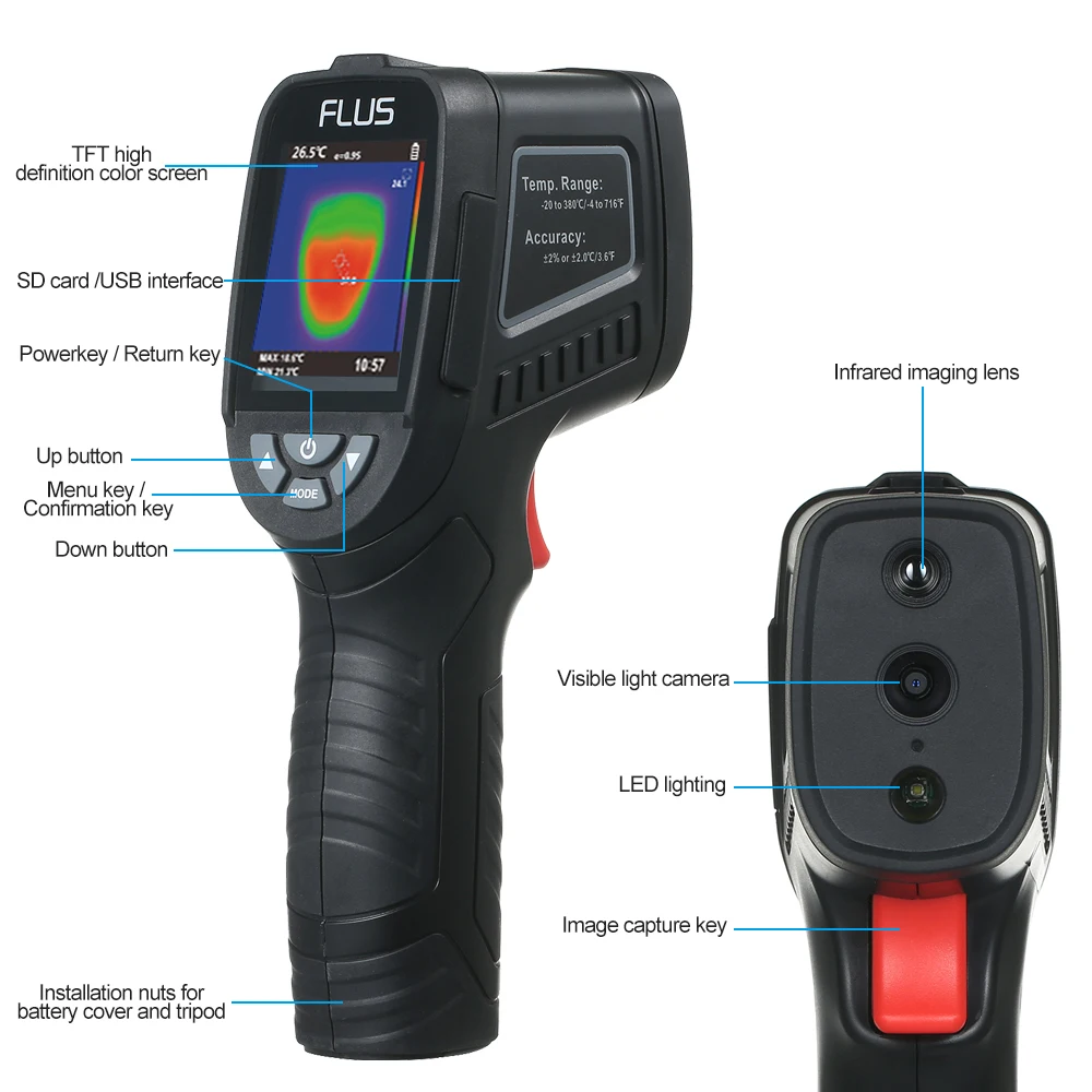 Эта инфракрасная тепловизионная камераТепловизорИспользуется для измерения температуры объекта. С тепловым отображением в режиме реального времени 5 режимов измерения и 5 различных цветовых палитр для лучшего детального отображения объекта.