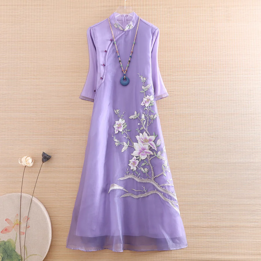 Высококачественное летнее женское платье Ципао из органзы в стиле ретро, элегантное платье с вышивкой и рукавом 3/4 А-силуэта, женские вечерние платья Qiapao, S-XXL