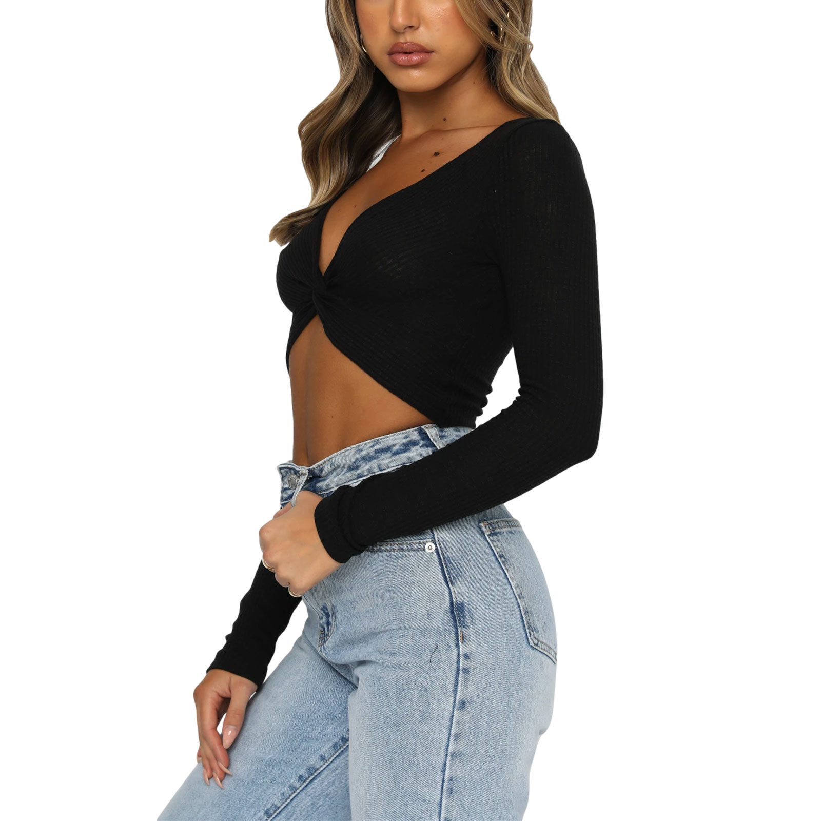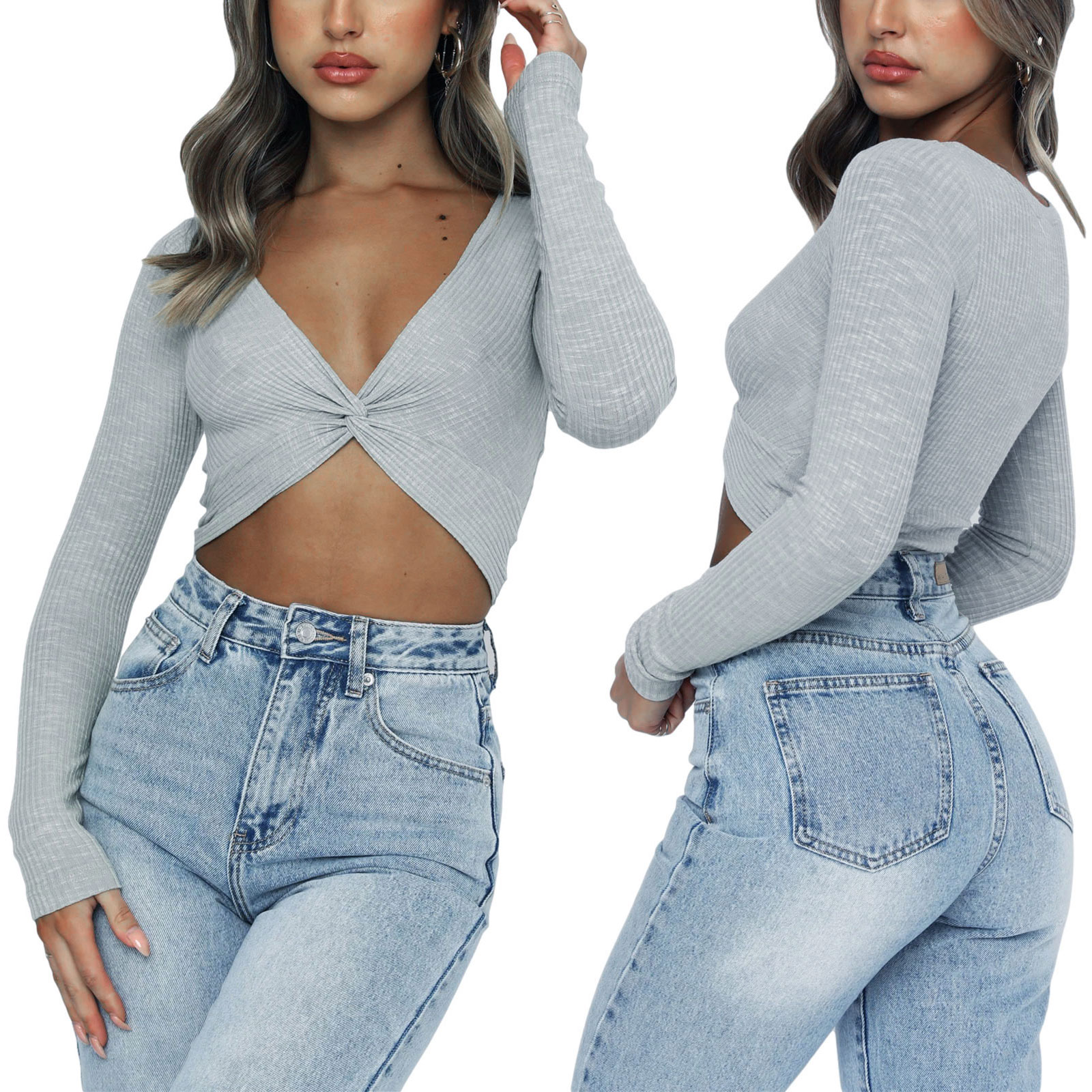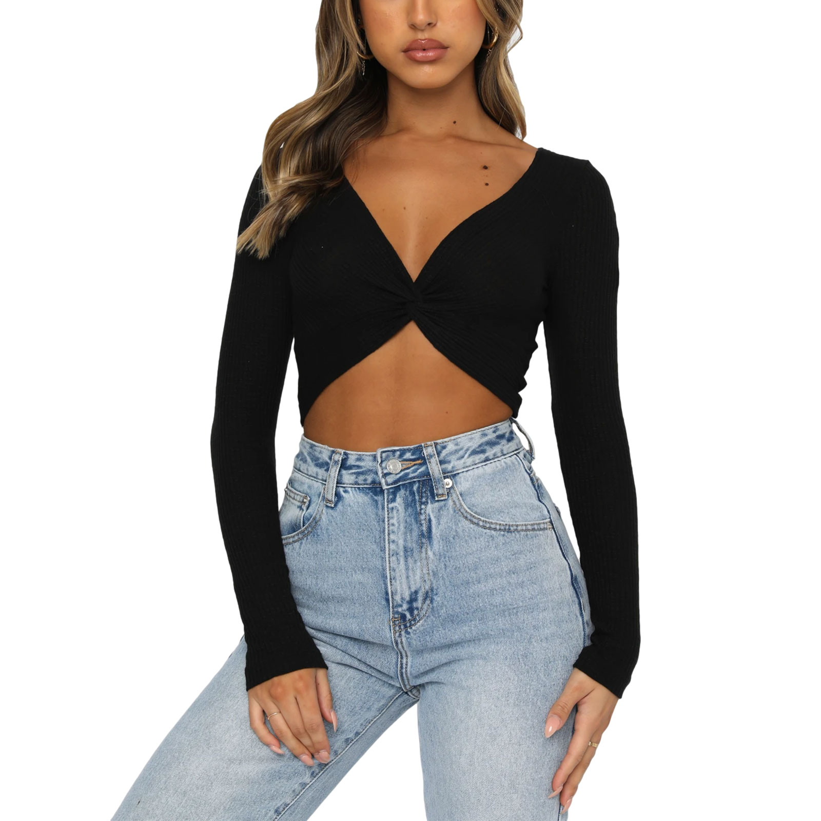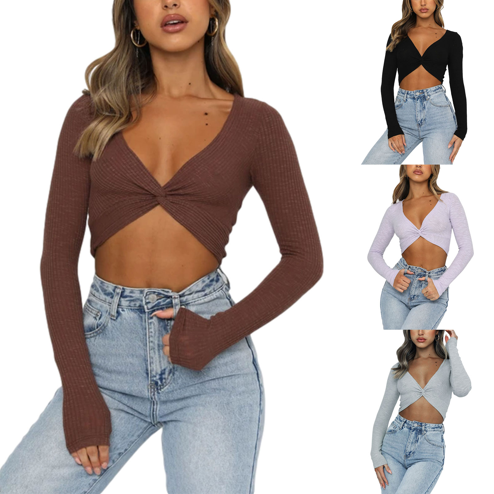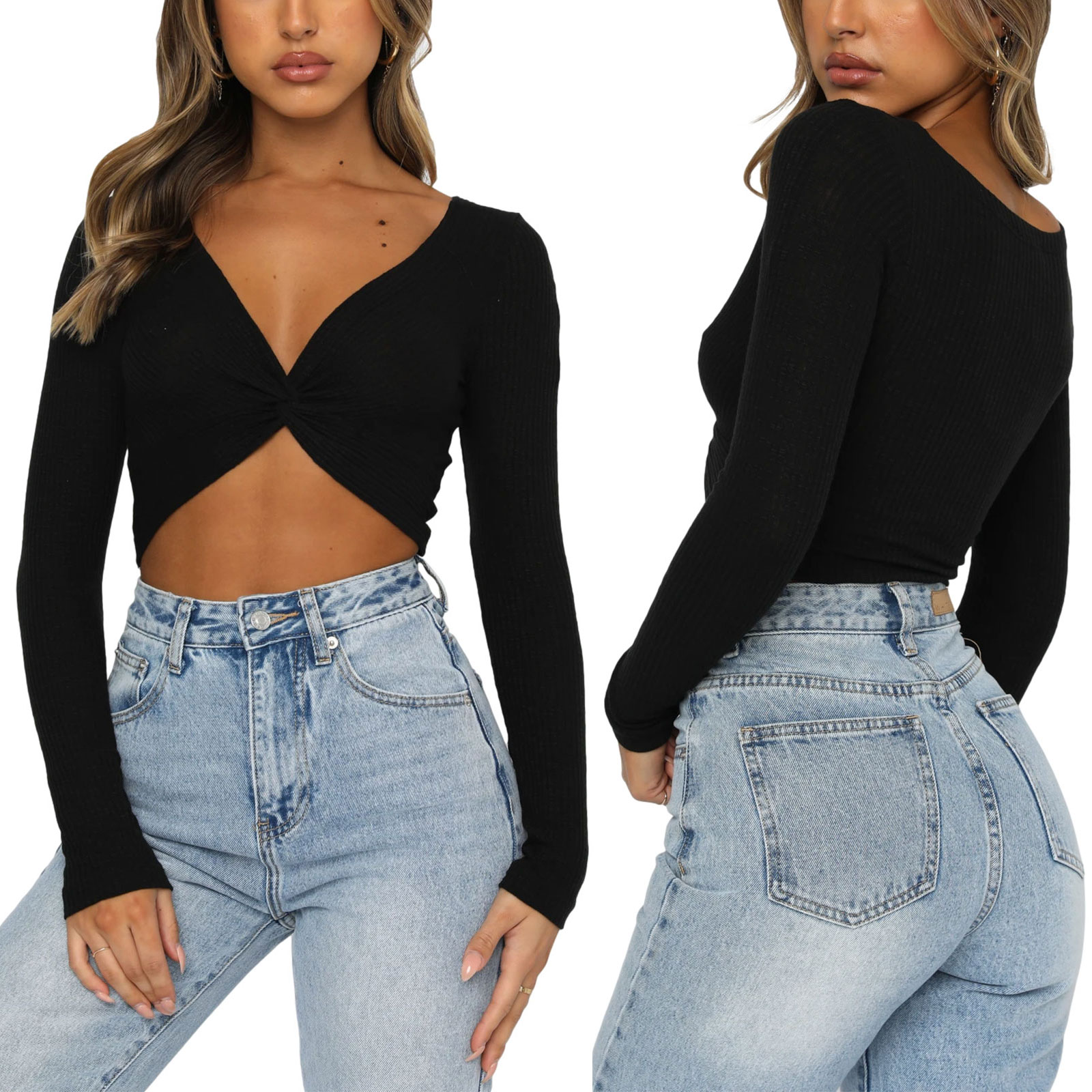 Женский укороченный топ, однотонная трикотажная футболка с длинным рукавом и глубоким v-образным вырезом