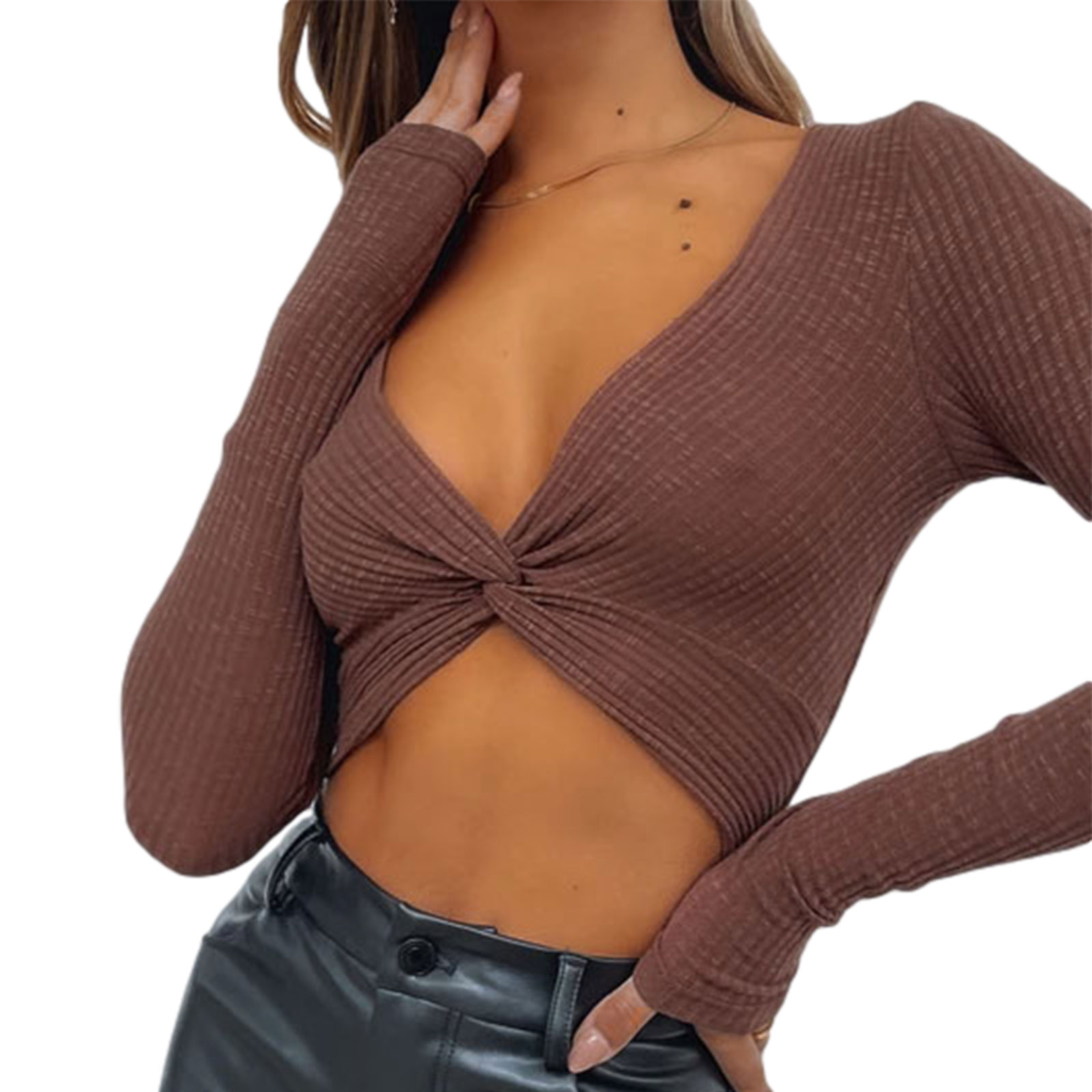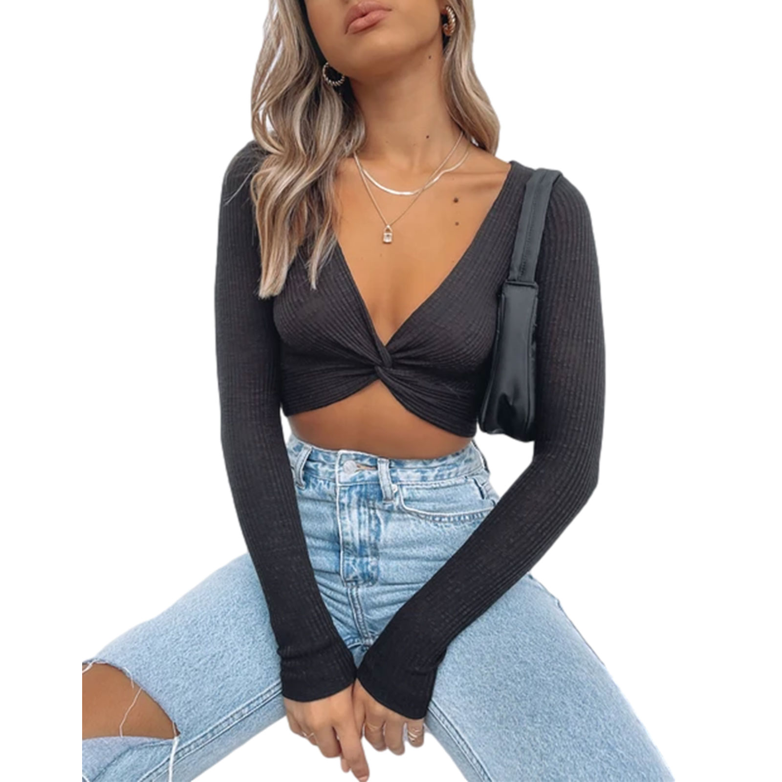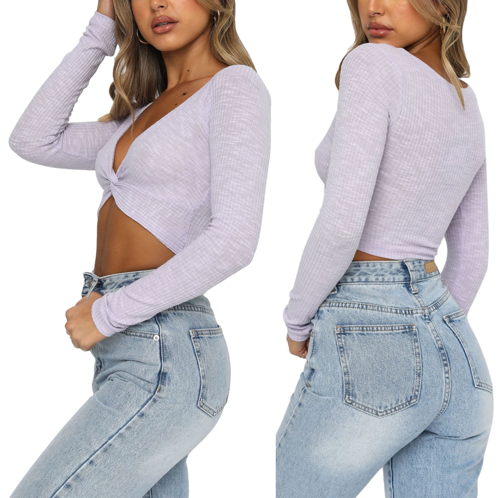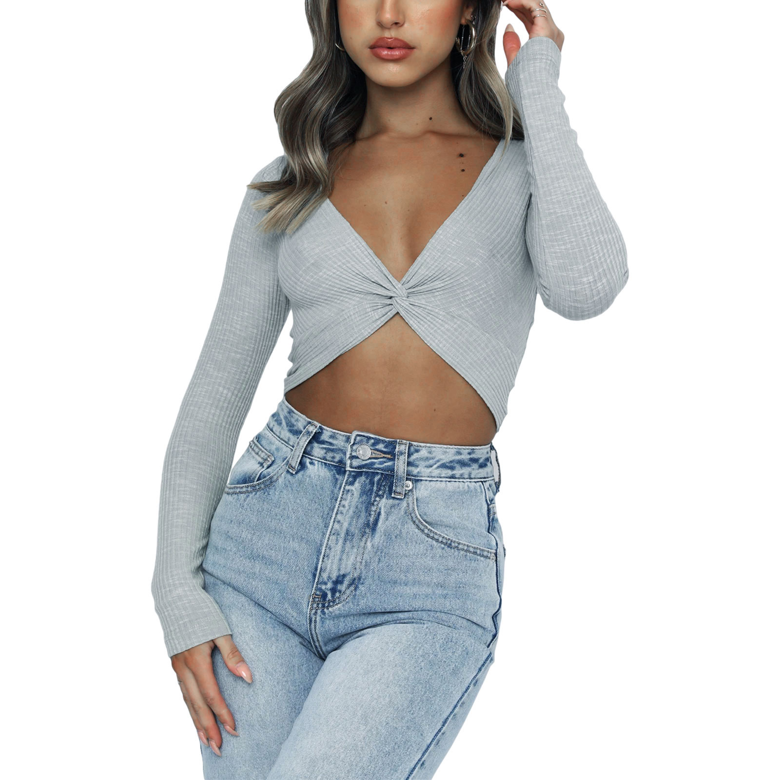 Женский укороченный топ, однотонная трикотажная футболка с длинным рукавом и глубоким v-образным вырезом