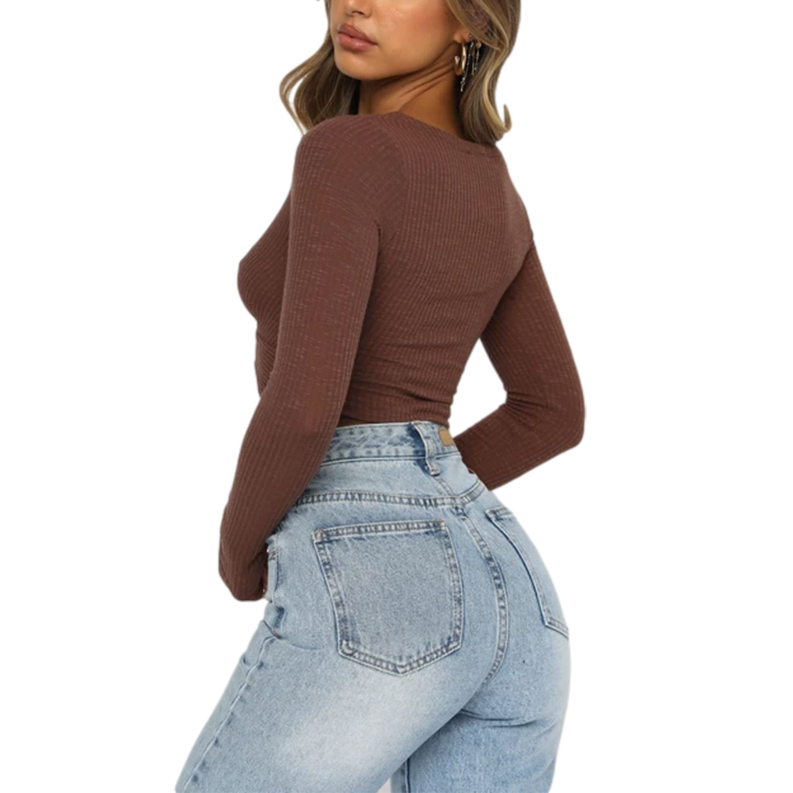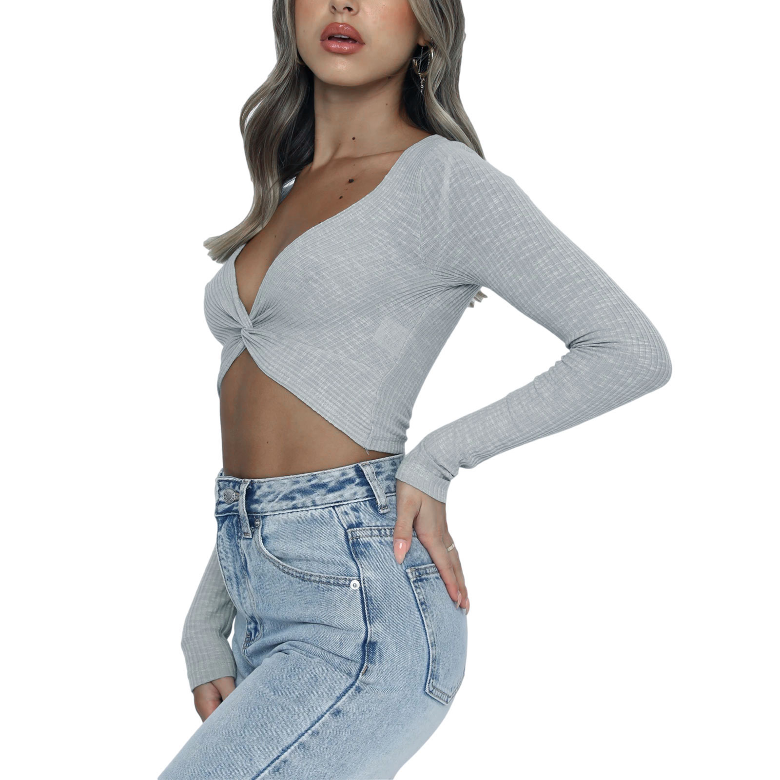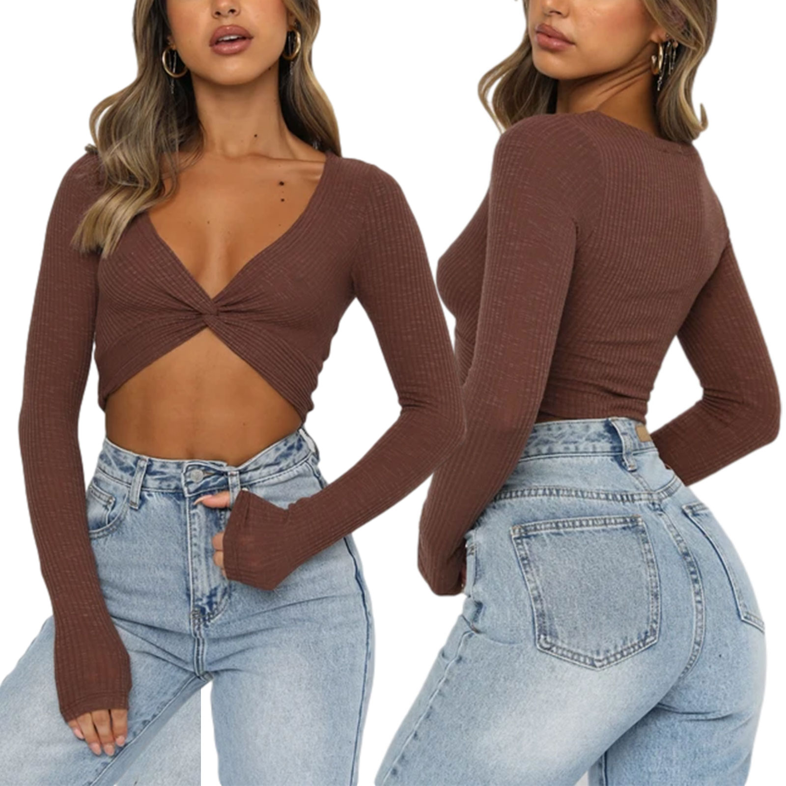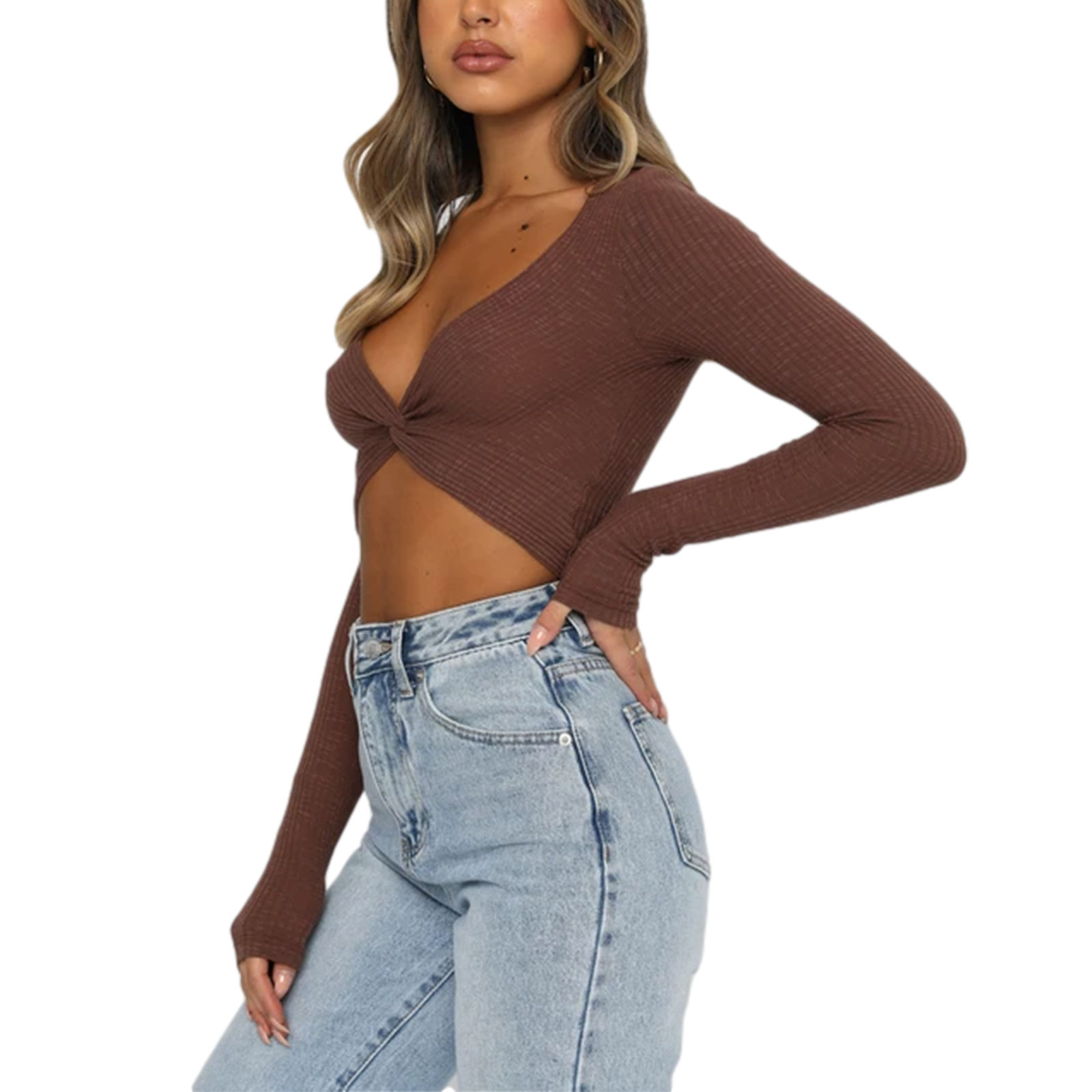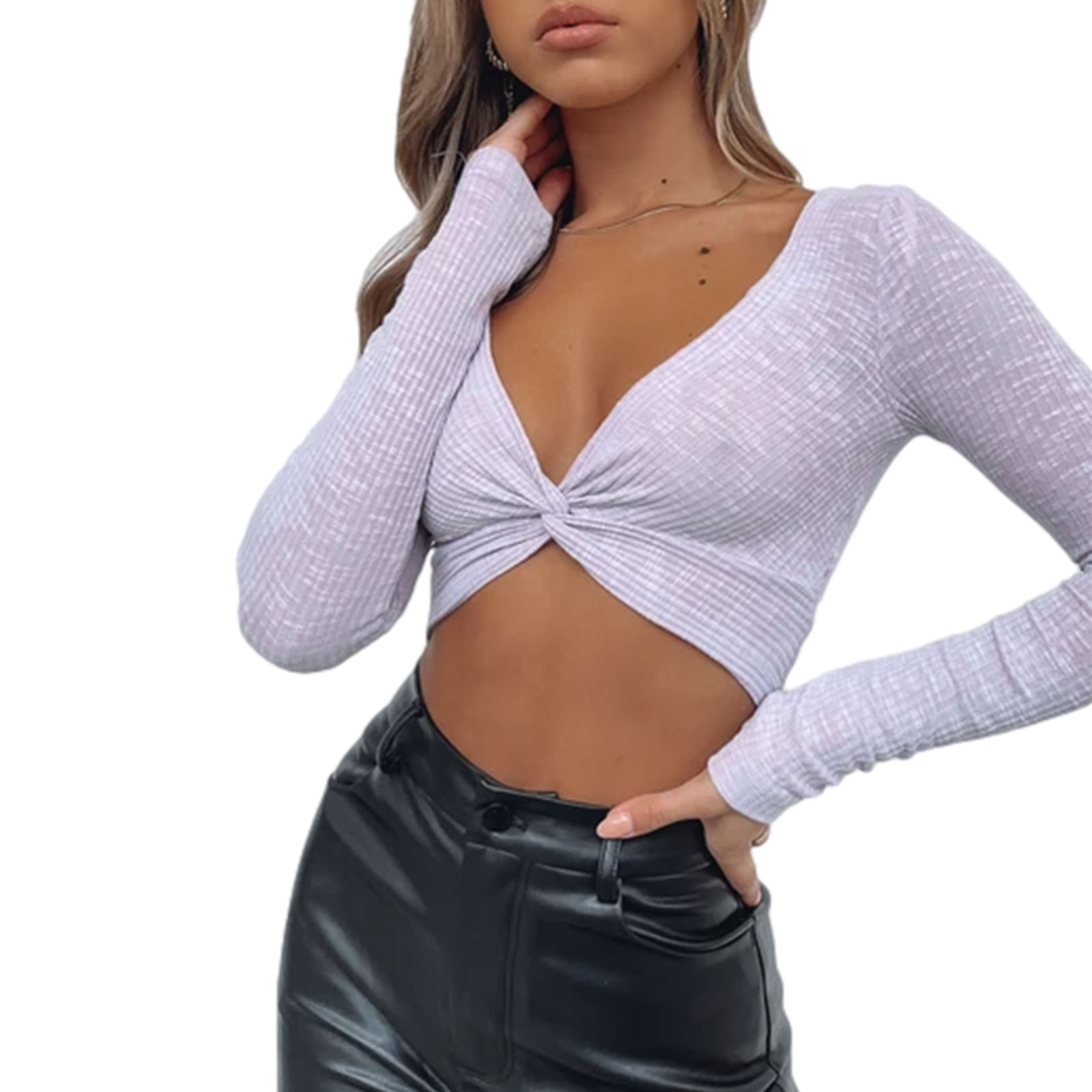 Женский укороченный топ, однотонная трикотажная футболка с длинным рукавом и глубоким v-образным вырезом