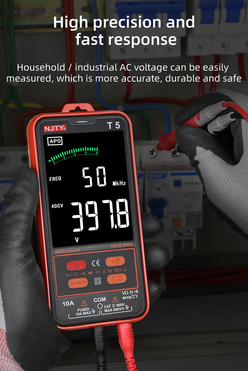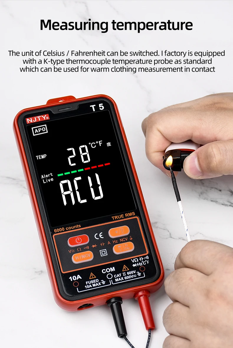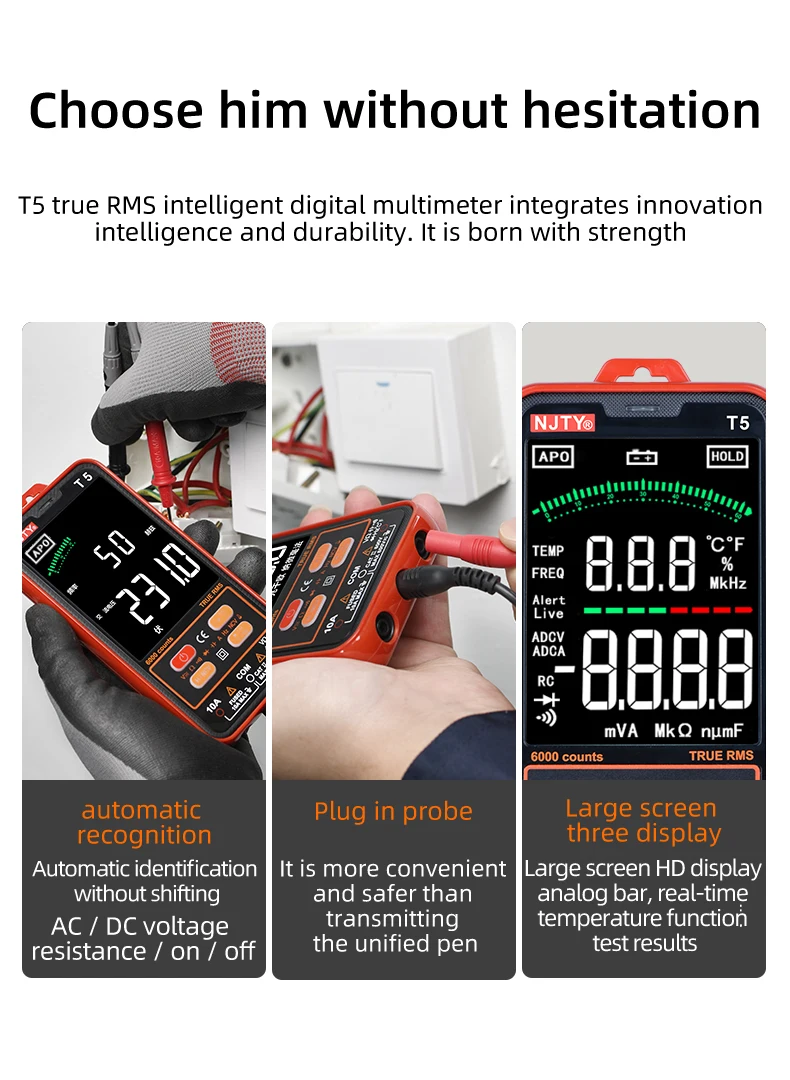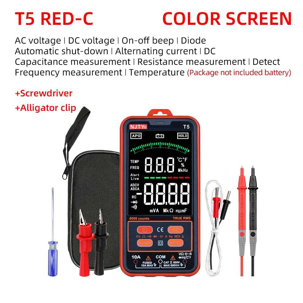 Описание характеристики T5:1. Оснащен мягким защитным корпусом, противоскользящим покрытием;2. Большой экран С подсветкой (T5 - B),Дисплей яркий и четкий, не нужно беспокоиться о том, что на экране будет темно и неясно; (Если вы часто работаете при сильном солнечном свете, мы рекомендуем вам купить T5-B общий экран)3,6000 подсчитывает большое количество, дополненное реальной эффективной функцией стоимости, измерение быстрое и точное;4. Измерение температуры. Датчик температуры K-type оснащен продуктом, который удобен для пользователей для измерения температуры различных жидкостей;5. Функция измерения чрезвычайно богата, может не только измерять напряжение, но и измерять ток, а также другие функции, такие как сопротивление, емкость, частота, диод, NCV и т. д.;6. Двусторонний светильник для вспышки, может использоваться как аварийный светильник, очень практичный;7. Простая эксплуатация, широкий спектр использования, широко используется в электрической, электронной, авиационной, преподавательской и других отраслях промышленности.-Товары в посылка(Аккумулятор в комплект не входит)1 * мультиметр1 * Руководство по эксплуатации1 * Тестовые провода1 * Датчик k-типа1 * Портативная сумка