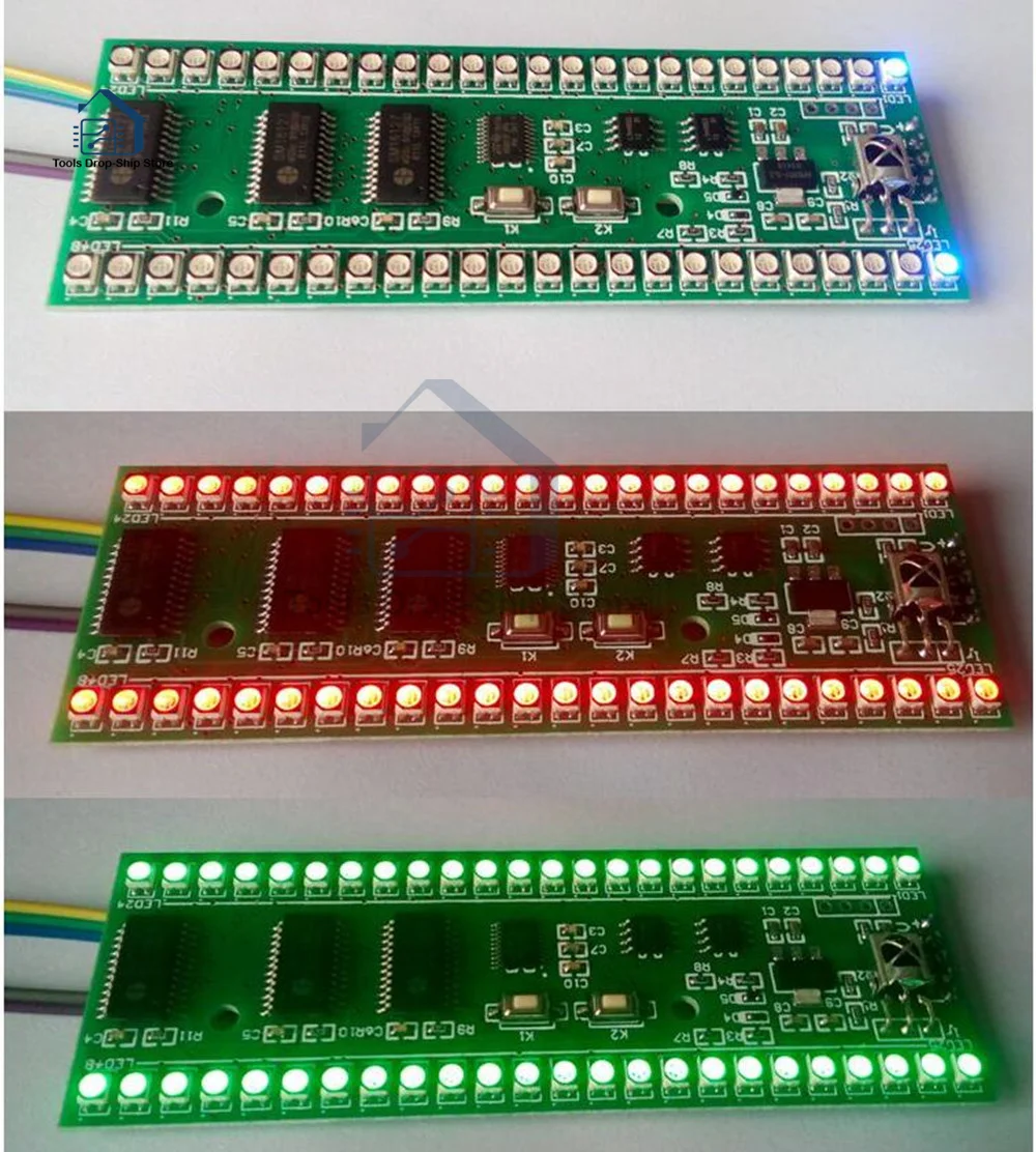 С использованием трех цветов SMD светодиодный, красочный, цвет гибкой конфигурации, сборные различные цветовые схемы, может установить цветовую схему, специфический цвет каждой точки, есть различные дизайн может выбрать, можно регулировать яркость, чувствительность регулируется, можно настроить инфракрасный пульт дистанционного управления, удобное Самообучение, (Вам нужно подготовить инфракрасный пульт дистанционного управления самостоятельно, поддерживает только тогда/E/C, этот формат более распространен, можно взять домой попробовать телевизор, телеприставки, Я возвращаюсь домой в девять приемников дистанционного управления, дистанционного управления, haier TV Tmall magic box пульт дистанционного управления и отходы VCD дистанционного управления тест может быть использован, Пульт дистанционного управления для домашних электрических вентиляторов и кондиционер, пульт дистанционного управления, тест не может использоваться).