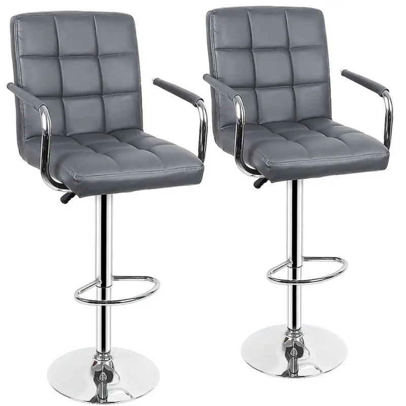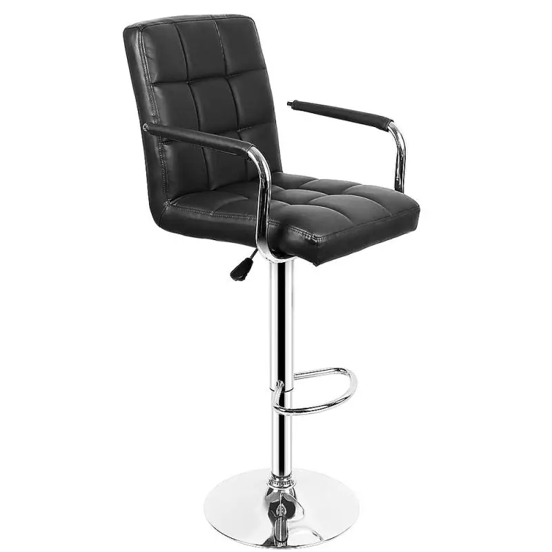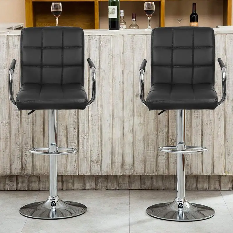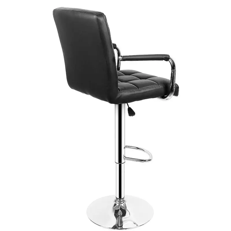Пара черных барных стульев с девятью отделениями и половинной подставкой для ног, хромированная металлическая конструкция, вращение на 360 градусов, регулируемая по высоте, заполненная высокоэластичной поролоновой губкой, плотность: 24 кг/м3, внешний слой из искусственной кожи (ПУ)