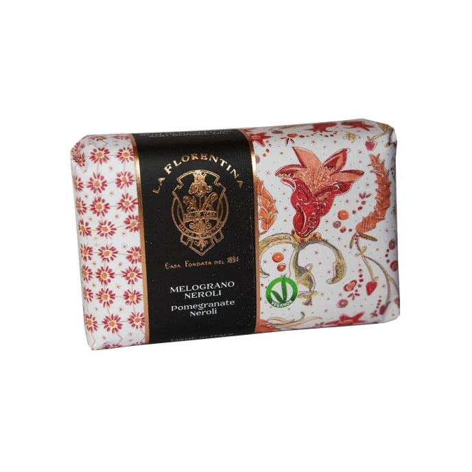 Мыло упакованное в крафтовую бумагу, на которую нанесены орнаменты и пейзажи, созданные итальянскими художниками, вдохновленными тосканской природой.