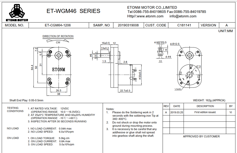 DC12V Скорость без нагрузки: 6 об/мин (± 10%)