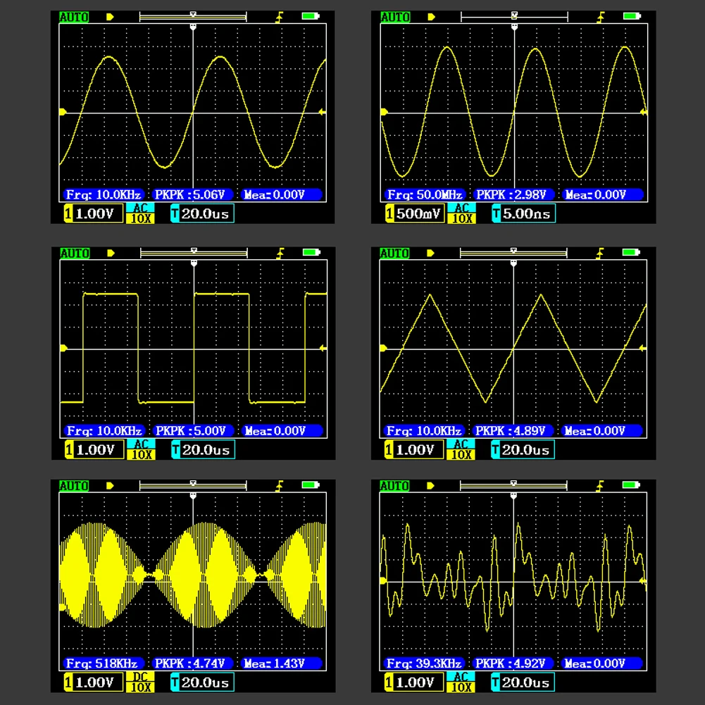 Это своего рода качественный осциллограф с пропускной способностью 120 м и частотой дискретизации 500 м, более стабильный и с более высокими осадками. 14 доступных вариантов измерения, частота, пики-пики, рабочий цикл, амплитуда, RMS, средняя, период, + ширина импульса,-ширина импульса, Макс, мин, верх, основание,-Рабочий цикл. Поддержка переключателя выходного сигнала: Синусоидальная волна, квадратная волна, треугольная волна и т. д. Широкое применение на mcu отладки, ремонт автомобилей, Ремонт бытовой техники, DIY электронная конкуренция, отладка питания, инвертор и т. Д. Вы можете попробовать.
