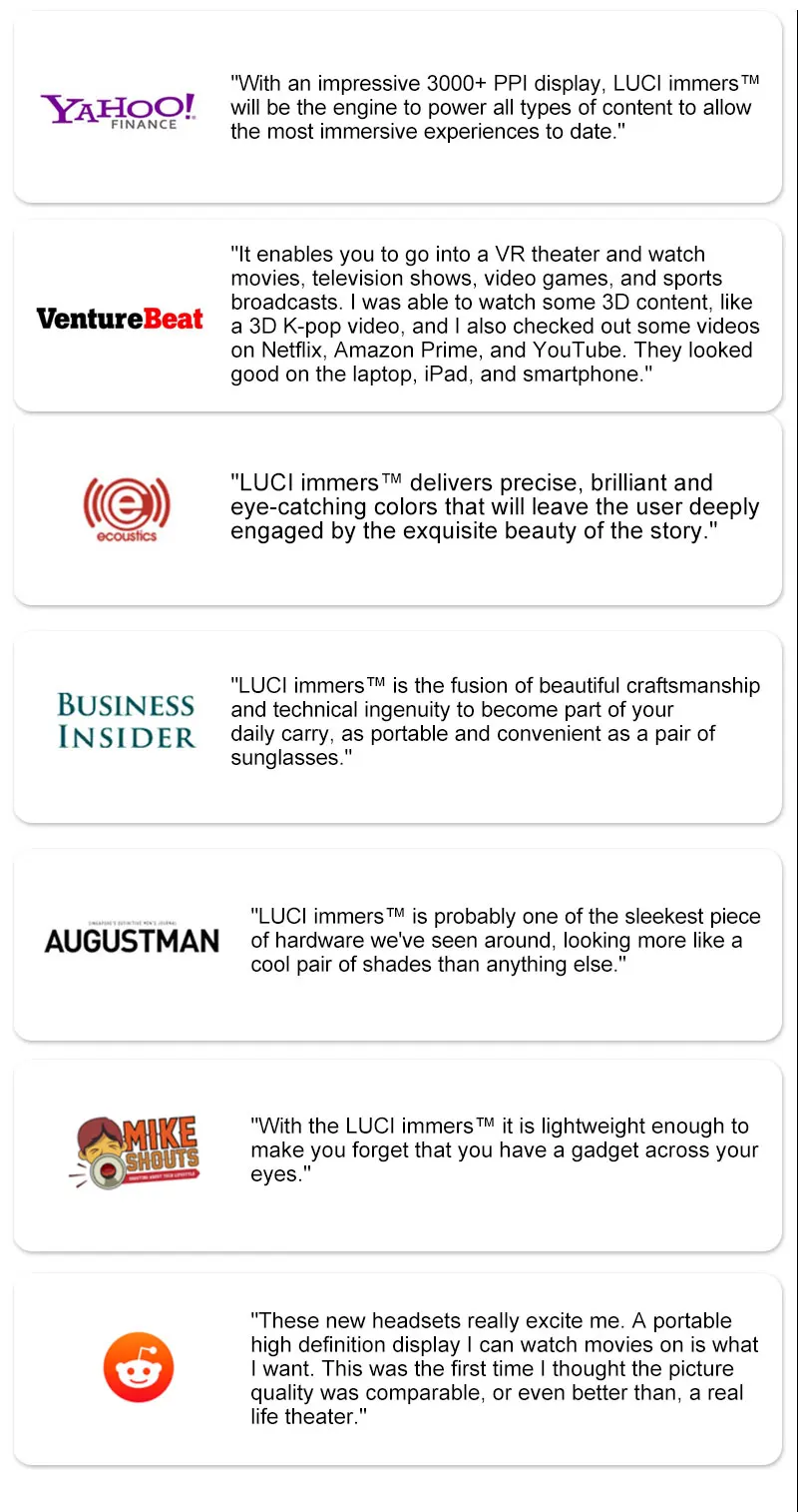 LUCI envisioned a user experience free from the current limitations of wearable technology. A product that's so lightweight, easy to use, and so visually stunning it disappears into the experience. In order to create the definitive viewing experience, LUCI collected industry experts from around the globe to tirelessly research and tested. What we are developing is so radically different from the existing products. We created a new standard to describe it — "Immersion-On-Demand"(IOD).