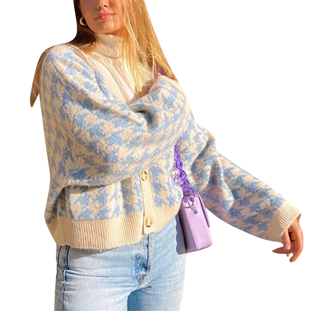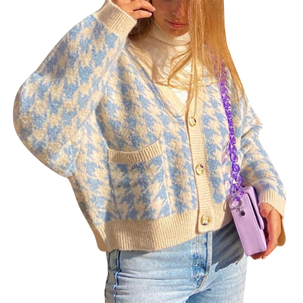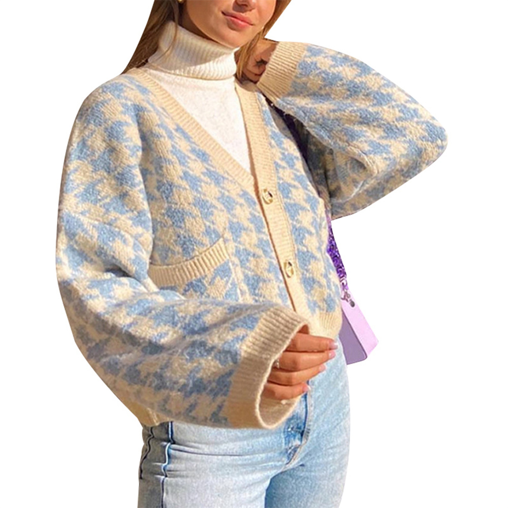 Женское пальто-кардиган с принтом «гусиная лапка», трикотажная одежда с длинными рукавами и v-образным вырезом