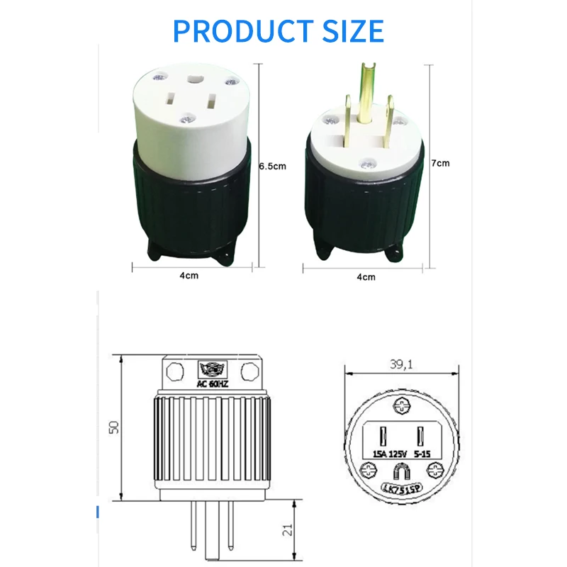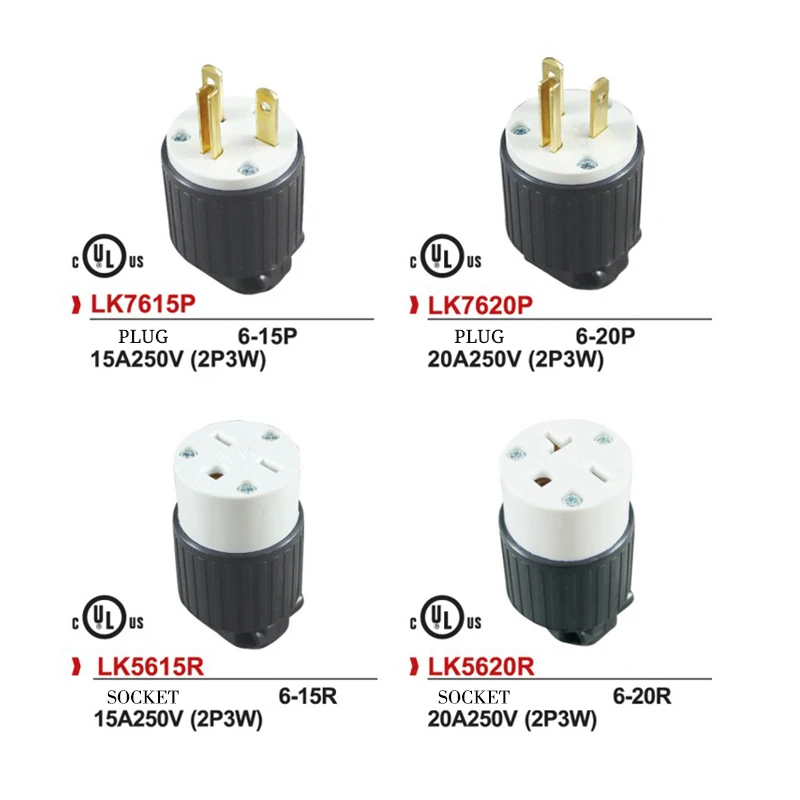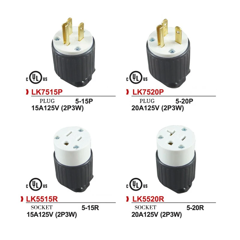 Модель: LK7515P/LK5515R/LK7615P/LK5615R/LK7520P/LK5520R/LK7620P/LK5620R * Напряжение тока: 15A/20A 125V /250V * Стандарты: NEMA 5-15P и NEMA 6-15P * Материал: нейлон + медь * Сертификация: Сертификация UL * Область применения: медицинское оборудование, электронное оборудование, лампы и фонари, оборудование, печь для барбекю, небольшой генератор и другие сопутствующие продукты, проводка предлагается для подключения 14AWG(3*2,08 мм) ниже. * Размер: 1,8*0,8*2,2 дюймов