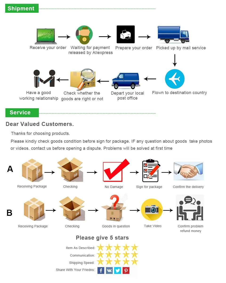 Для того, чтобы вы получили посылку быстрее и безопасно, рекомендуется использовать «AliExpress Standard Shipping or China Post Registered Air Mail» способ доставки. В соответствии с нашим многолетним опытом, обычные методы доставки легко теряются, что займет больше времени и затрат, чем вы платите дополнительную стоимость, чтобы выбрать более быстрый и безопасный способ доставки.
