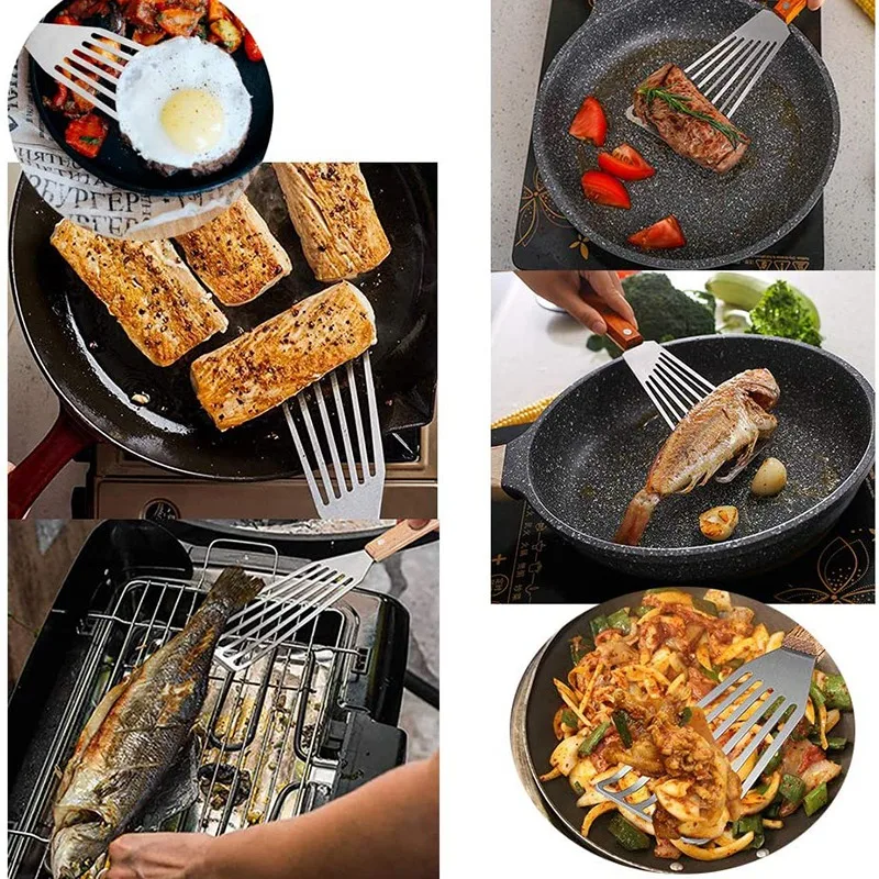 Посылка включает в себя 2 рыбных ЛОПАТКИ с деревянной ручкой, идеальный инструмент для приготовления пищи для вашей кухни. Размер кухонного шпателя подходит для приготовления пищи с помощью посуды или формы для выпечки. Кухонные лопатки для рыбы имеют отверстия в ручке для удобного подвешивания и хранения.