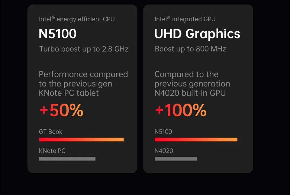 Alldocube взял производительность и пользовательский опыт 14-дюймовых ноутбуков на совершенно новый уровень GT Book оснащен передовой технологией Intel®Celeron®Процессор N5100 с турбочастотой до 2,8 ГГц, Intel®Графический процессор UHD, 12 Гб LPDDR4x высокоскоростная память и 256 Гб Твердотельный накопитель. Металлический корпус всего 6 мм Тонкий и весит 1,35 кг, что очень тонкий светильник для 14-дюймового ноутбука. Также есть Wi-Fi 6, Bluetooth 5,1, быстрая зарядка PD, мощные динамики с двойной звуковой полостью и т. д.