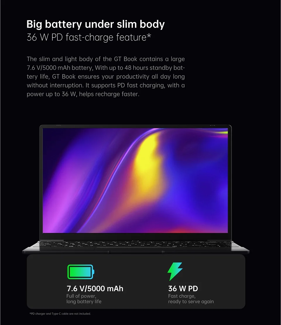 Тонкий светильник корпус GT Book содержит большой аккумулятор 7,6 В/5000 мАч, работающий до 48 часов в режиме ожидания, GT Book обеспечивает вашу продуктивность без перерыва в течение всего дня. Поддерживает быструю зарядку PD мощностью до 36 Вт, помогает быстрее заряжать.