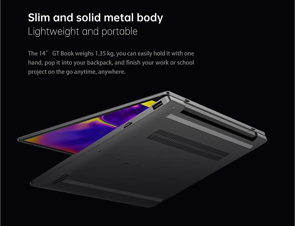 14 ”GT Book весит 1,35 кг, вы можете легко держать его одной рукой, положить его в рюкзак и закончить работу или школьный проект в дороге в любое время и в любом месте.