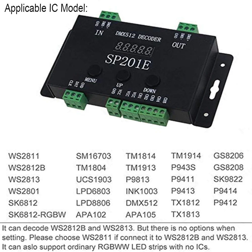 Модель: SP201E Symphony DMX512 декодер Напряжение источника питания: DC5-24V Рабочий ток: 24 мА ~ 110 мА Управляемые пиксели: 1024 пикселей/пикселей Рабочая температура: -20-60 ℃ Размер контроллера: 15*9,5*2,3 см Размер упаковочной коробки: 16*10*2,6 см Вес нетто: 270 г Вес брутто: 320 г Выходной сигнал: сигнал SPI Стандарт DMX512: DMX512/1990 Встроенные эффекты: 99 видов эффектов узора Режим управления: кнопочное управление, 512 консольное управление Поддержка IC: Поддержка обычных светодиодных драйверов IC на рынке, таких как WS2811/WS2812B/WS2813/SK6812/LPD6803/LPD8806 и т. Д.