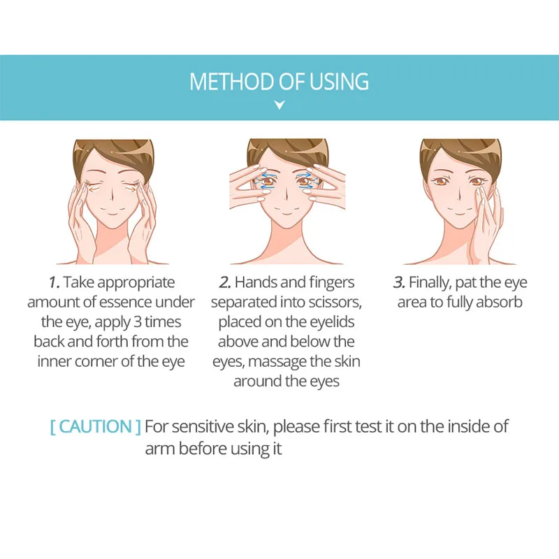 1. Возьмите необходимое количество эссенции под глазом, нанесите 3 раза назад и вперед от внутреннего лица глаза