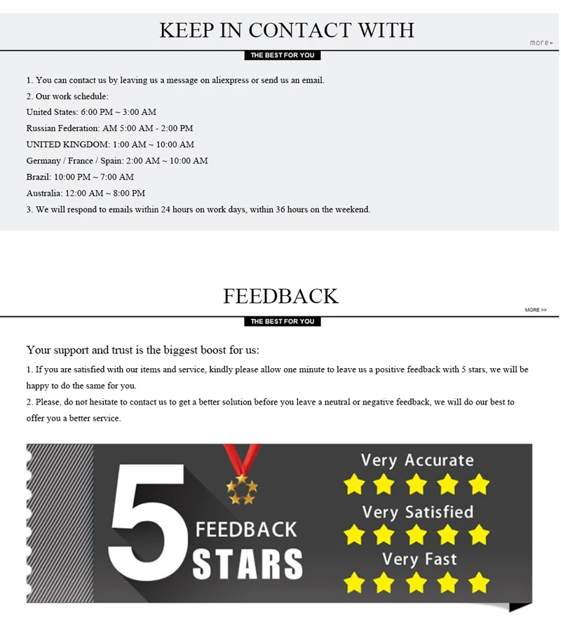 -Как правило, мы доставляем посылка вам в течение 2 рабочих дней, но если в Китае есть крупные акции или праздники на AliExpress, посылка может быть отложена. -Когда мы отправляем небольшие посылки, не превышающие 2 кг, при нормальных обстоятельствах тариф не будет, но если вы выберете Экспресс-доставку, при нормальных обстоятельствах будет взиматься плата. -Если вы хотите изменить информацию о заказе перед отправкой, пожалуйста, свяжитесь с нами вовремя. Информация об упаковке не будет изменена после отправки. О цвете и весе Для разных партий товара вес продукта может немного отличаться, и цвет, который вы видите на разных мониторах, также может отличаться. Если вы беспокоитесь о весе и цвете, пожалуйста, свяжитесь с нами, чтобы подтвердить перед покупкой. О сервисе Мы стремимся предоставить вам лучший опыт покупок, поэтому, если у вас возникнут какие-либо проблемы во время покупок, пожалуйста, свяжитесь с нами. Плохой аудит ничего не исправит, но мы можем, поэтому, пожалуйста, свяжитесь с нами перед проверкой, и мы постараемся решить проблему для вас. О магазине Мы являемся прямой фабрикой, мы поддерживаем розничную, оптовую и обычную продукцию. Если у вас есть какие-либо потребности, пожалуйста, свяжитесь с нами. Но из-за разницы во времени мы можем ответить немного поздно, но мы обязательно свяжемся с вами после того, как увидим ваше сообщение.