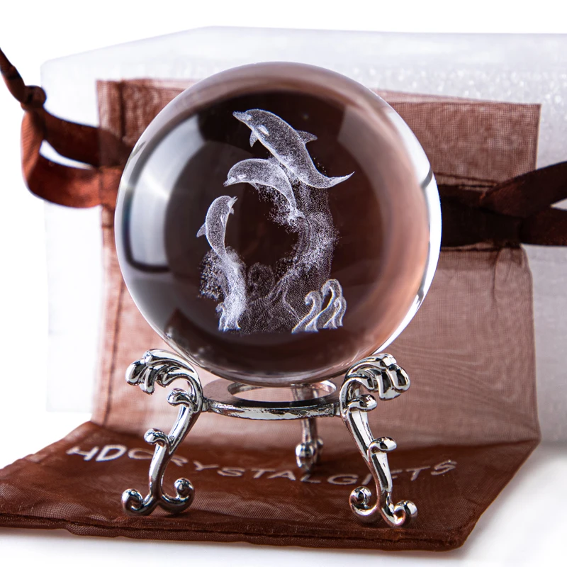 Дизайн: 3D лазерное изображение дельфинов плавает в середине прозрачного хрустального шарика. Красиво детализированное и эфирное изображение с 3D видом из дельфинов.