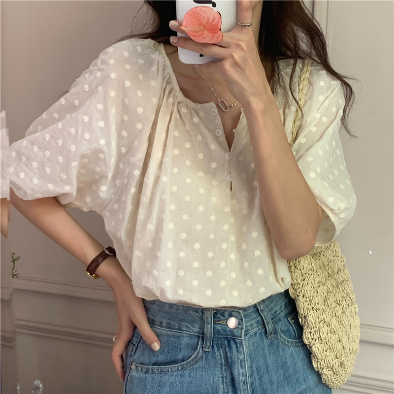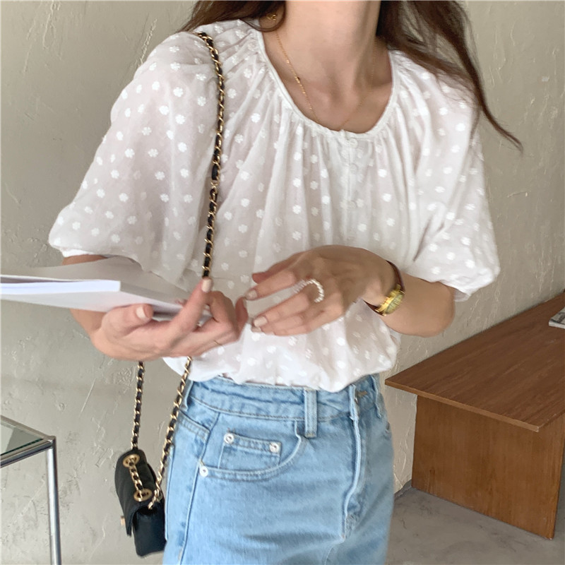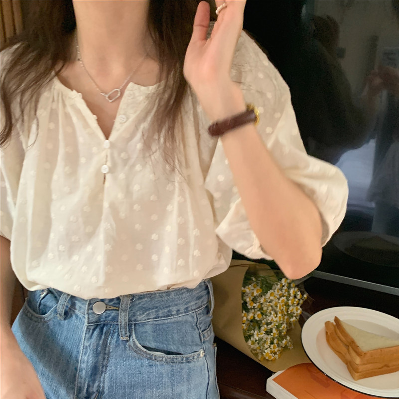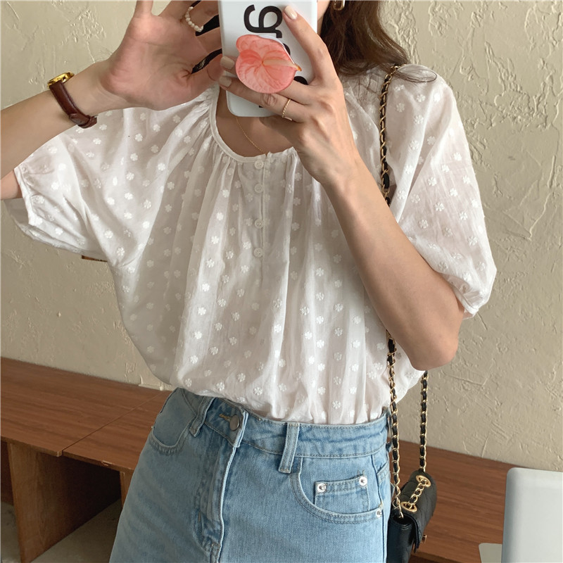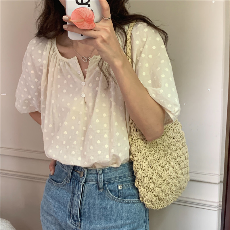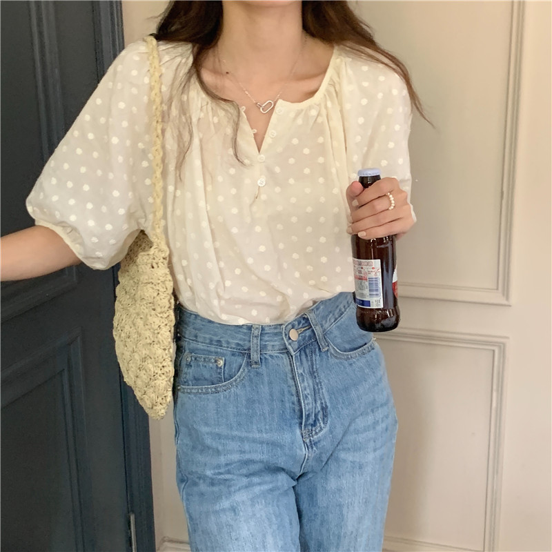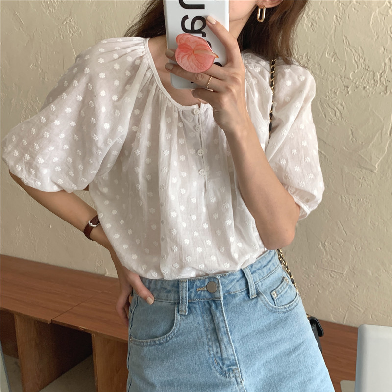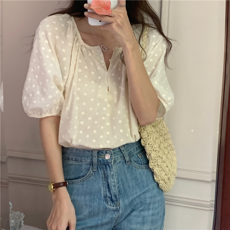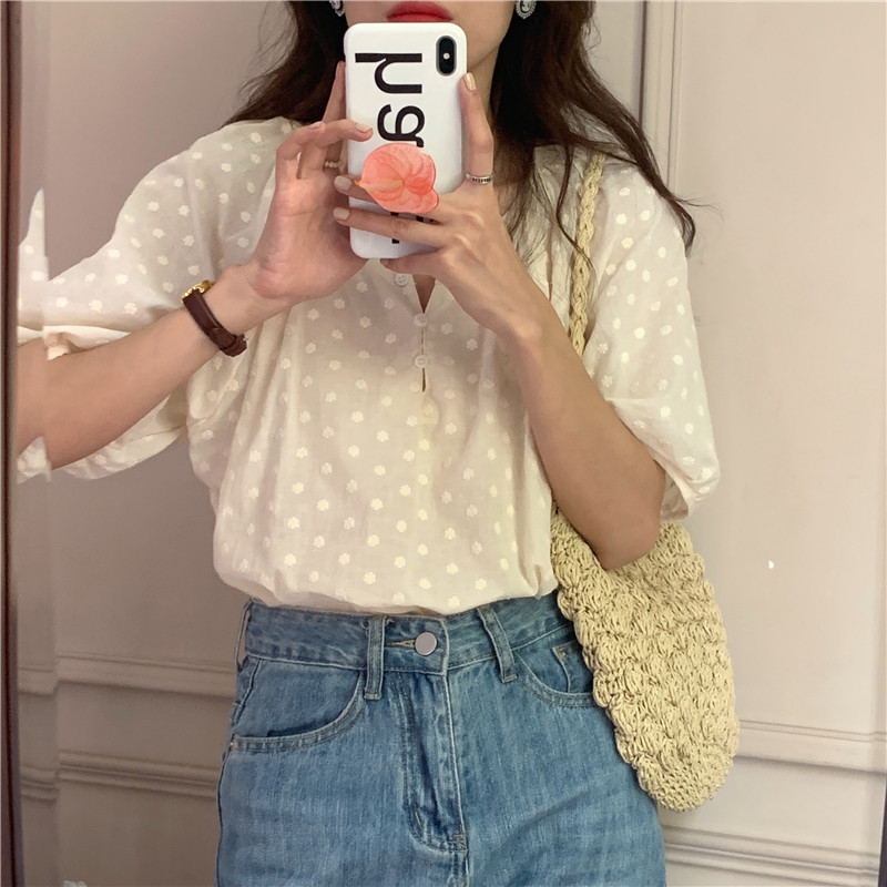 Женская блузка в горошек с воротником-стойкой и коротким рукавом | Женские блузки