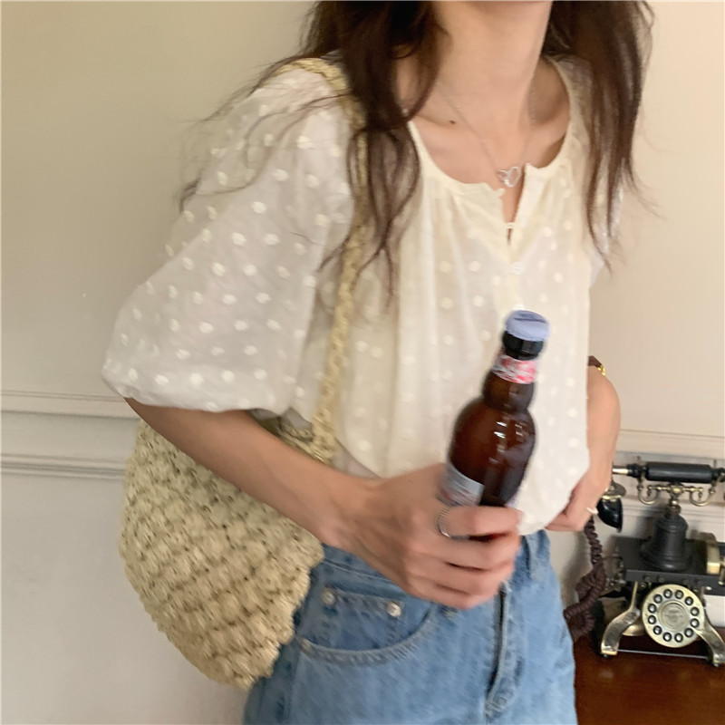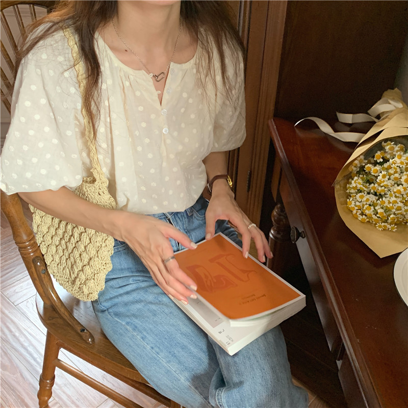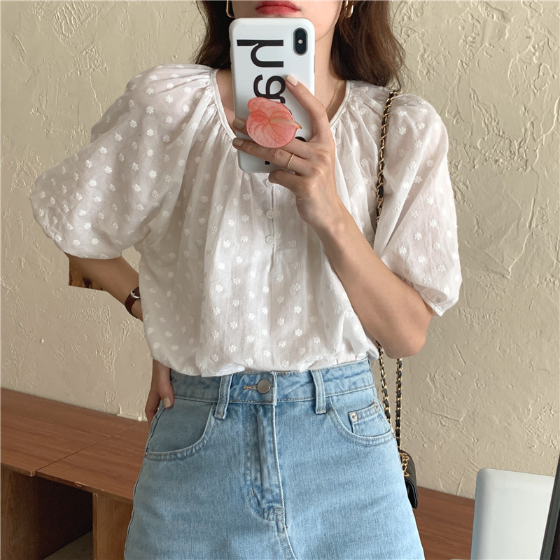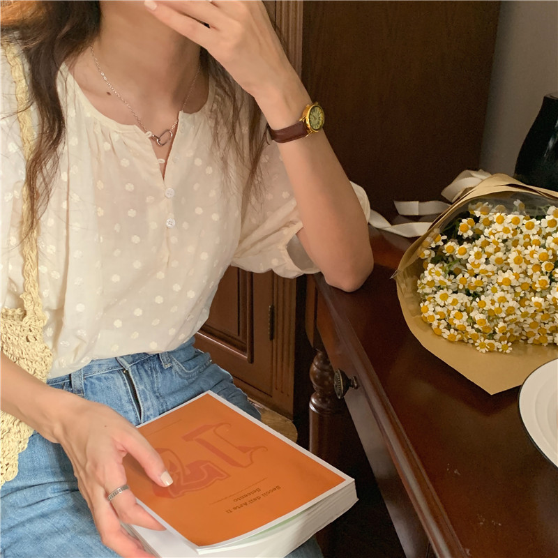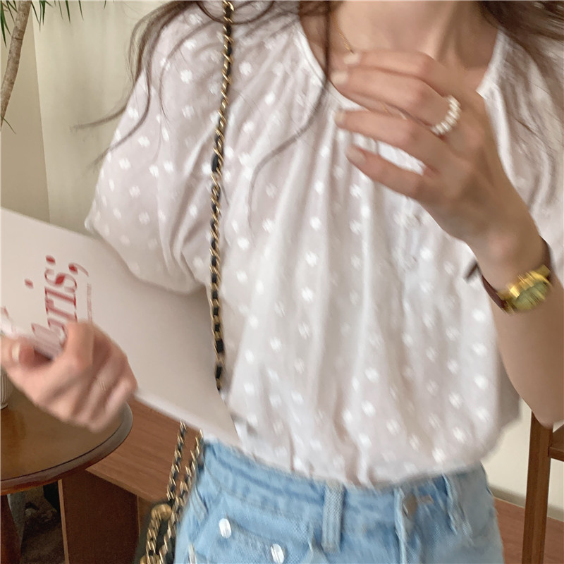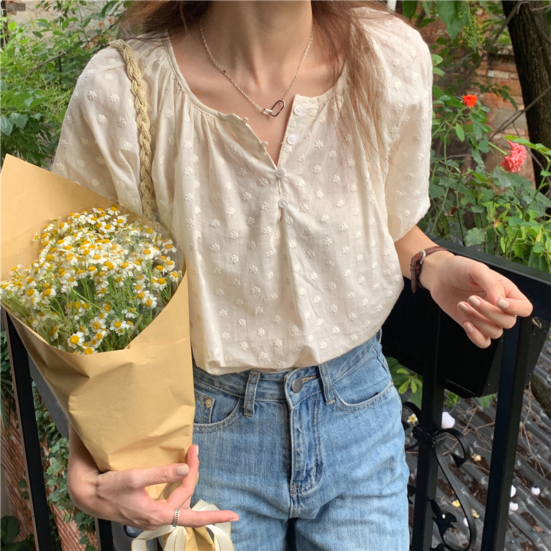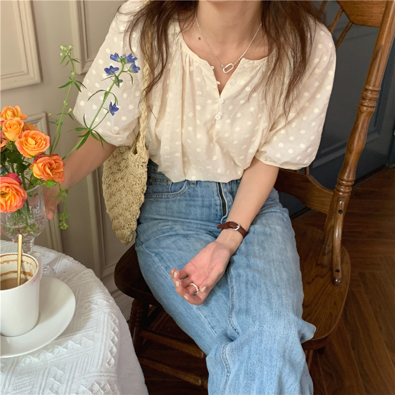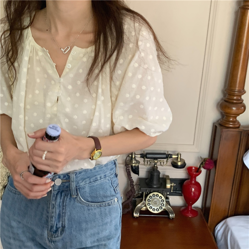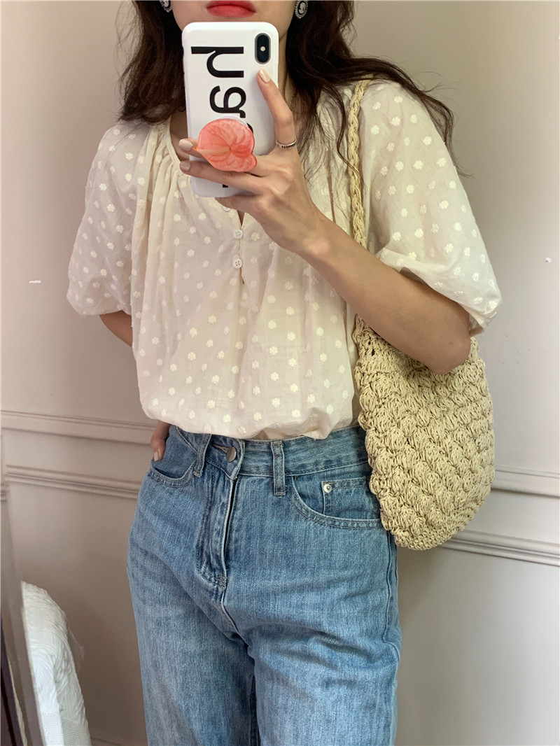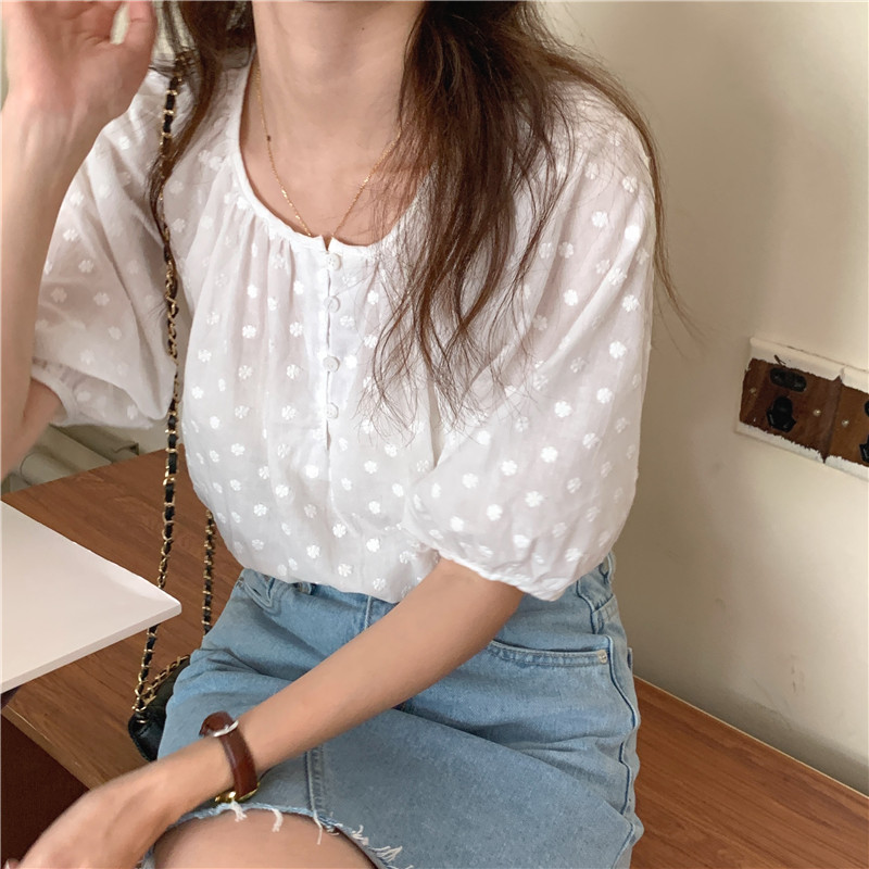 Женская блузка в горошек с воротником-стойкой и коротким рукавом | Женские блузки