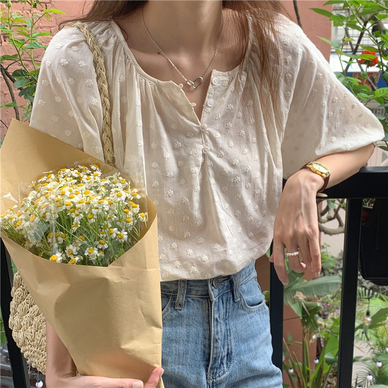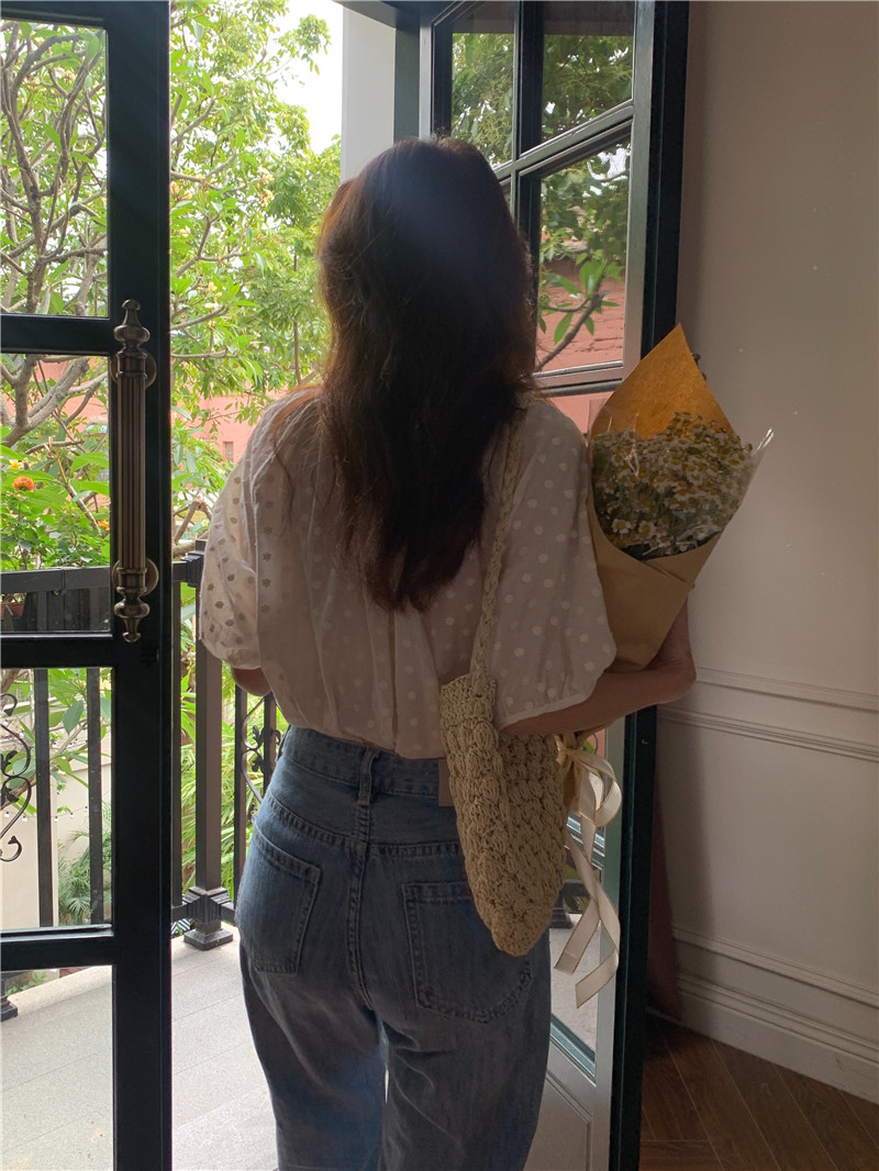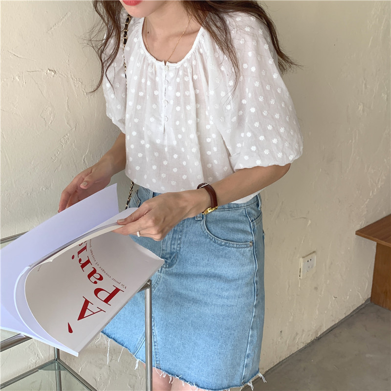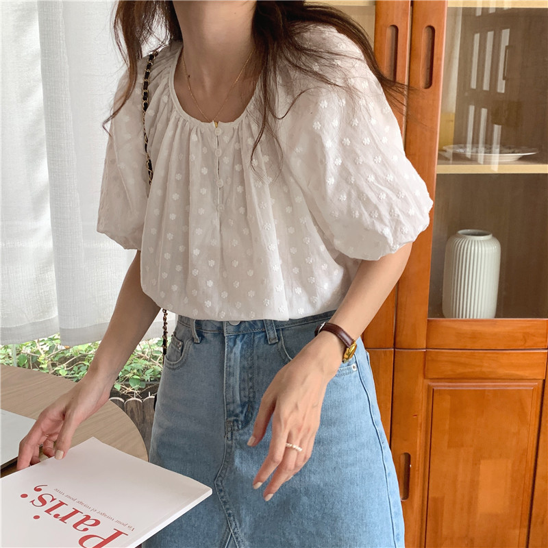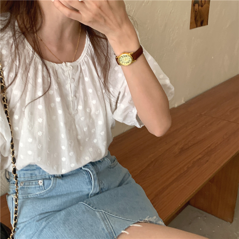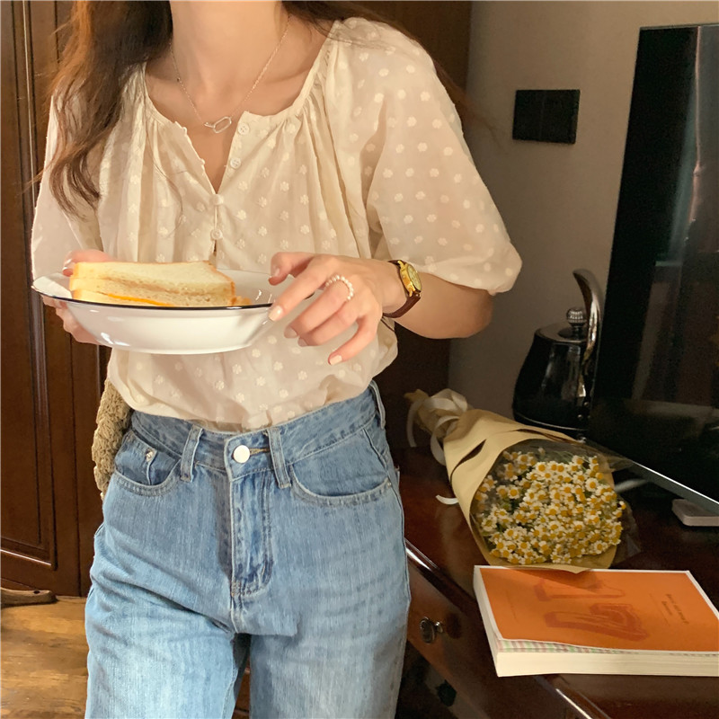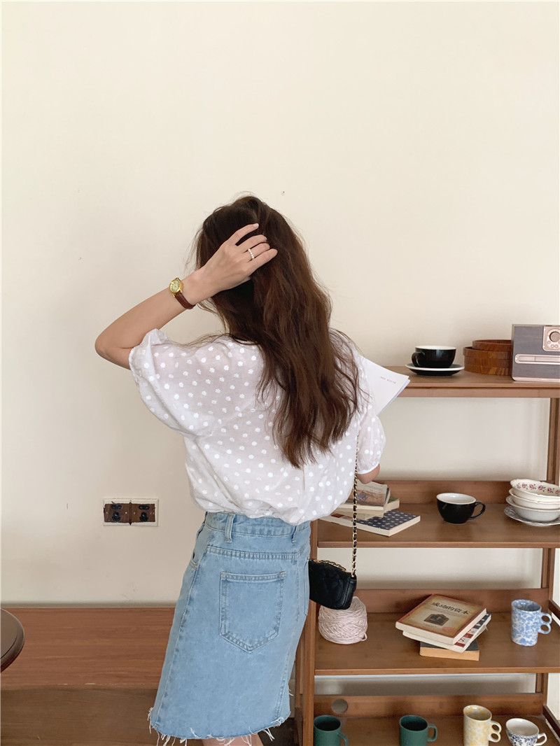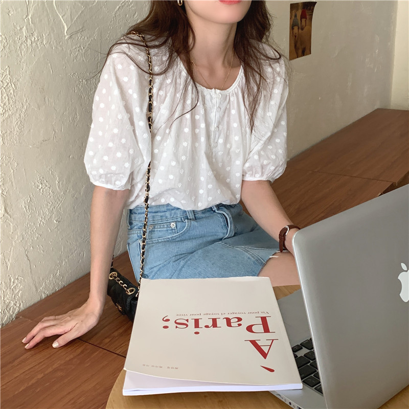Женская блузка в горошек с воротником-стойкой и коротким рукавом | Женские блузки