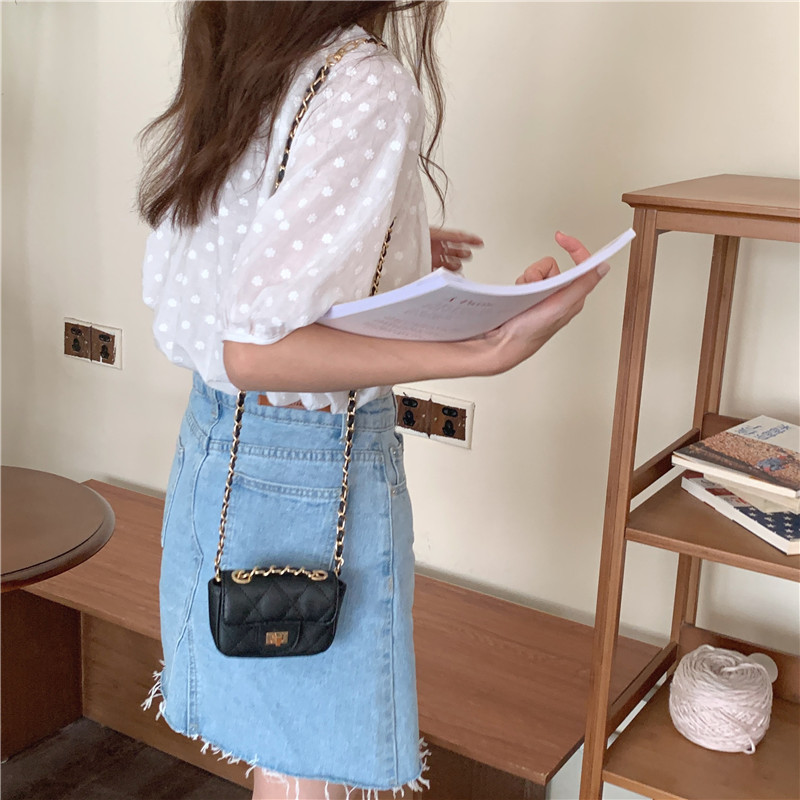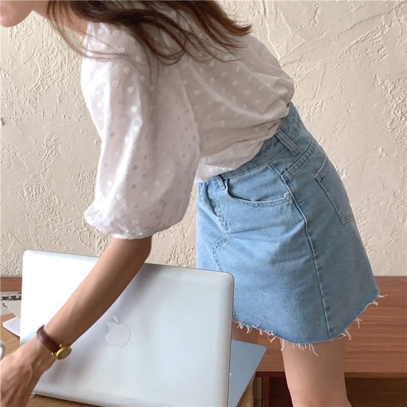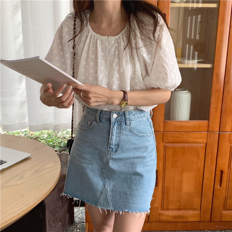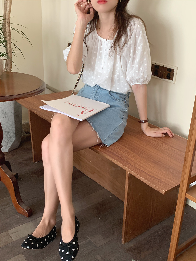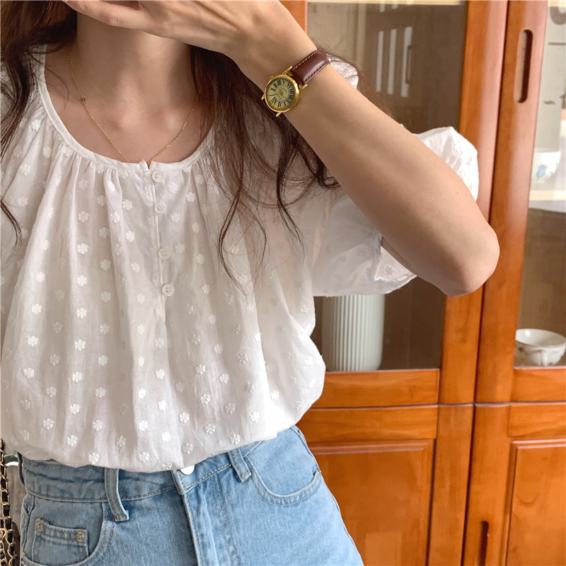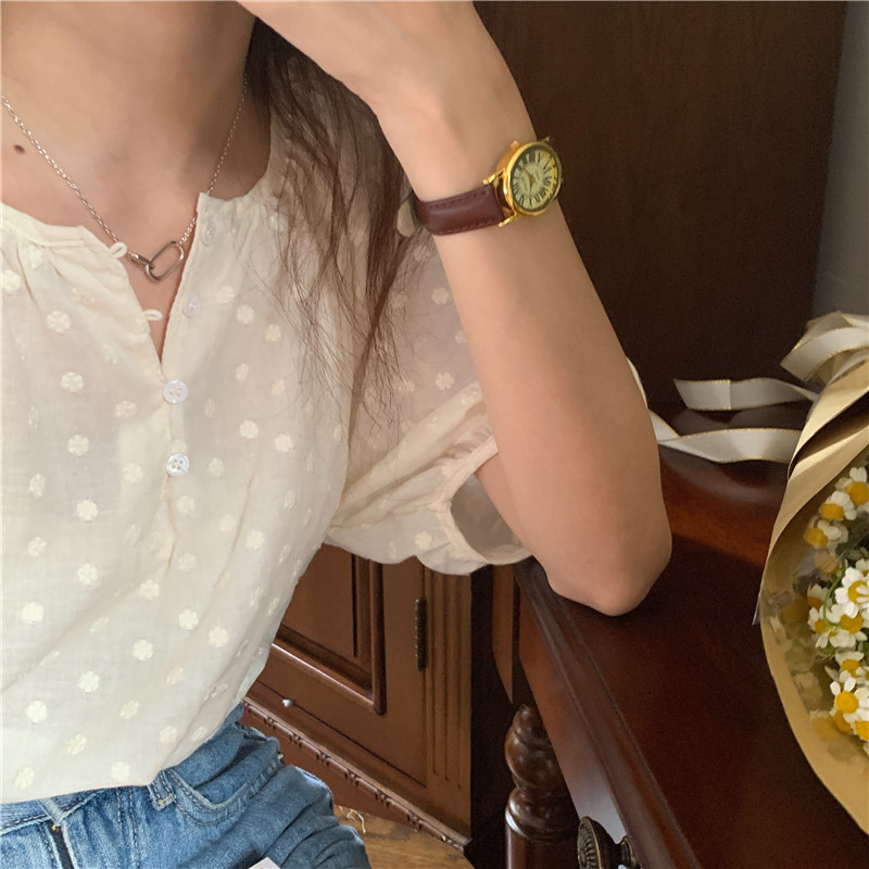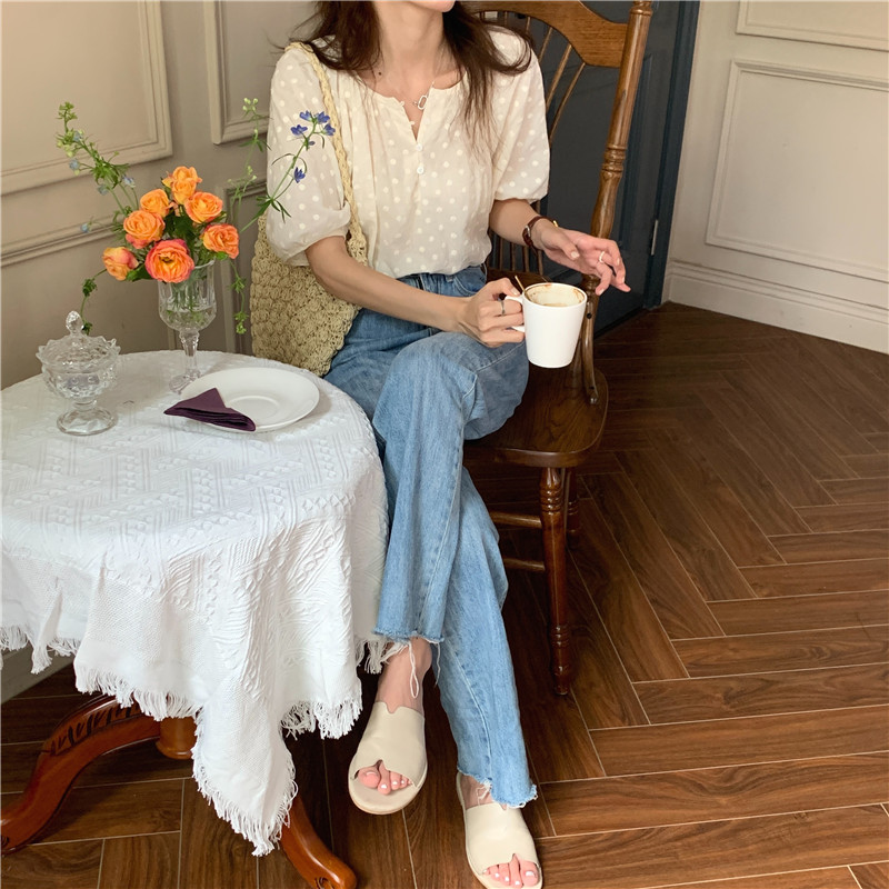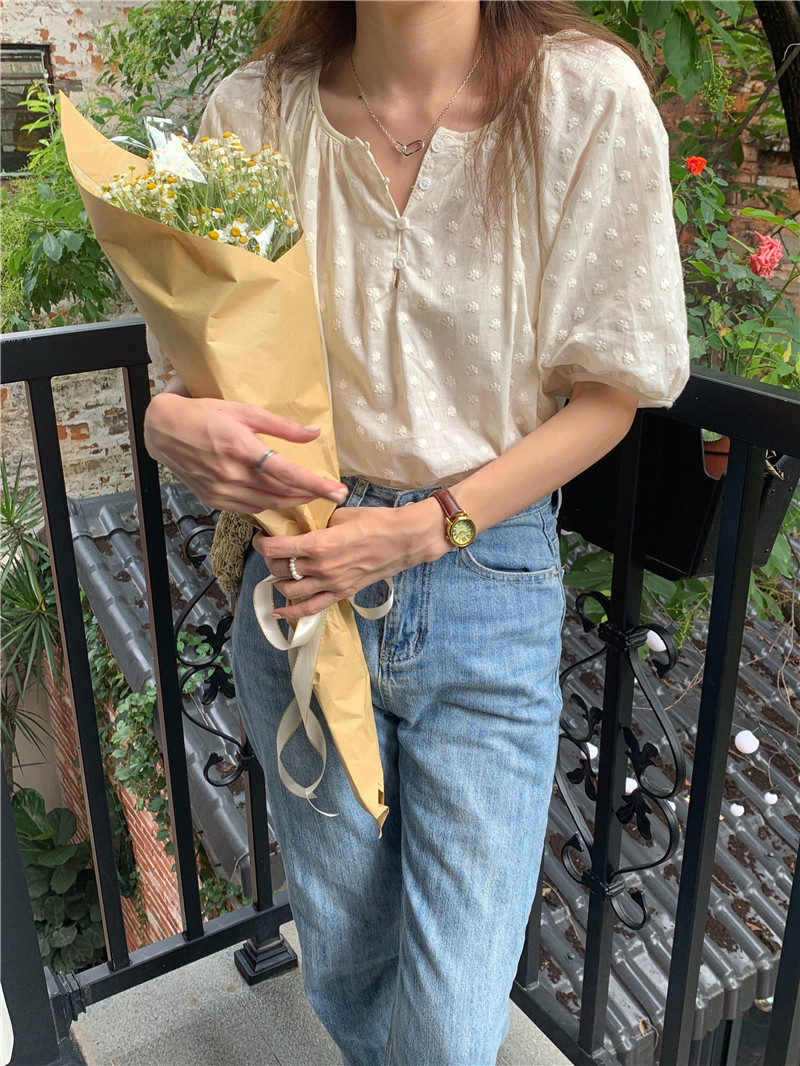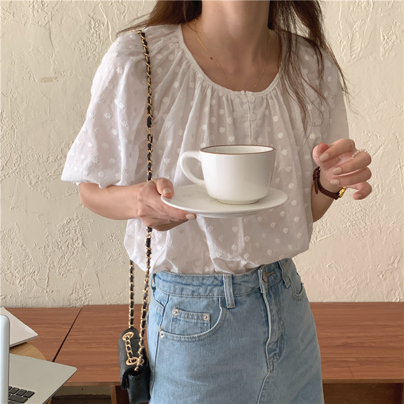 Женская блузка в горошек с воротником-стойкой и коротким рукавом | Женские блузки