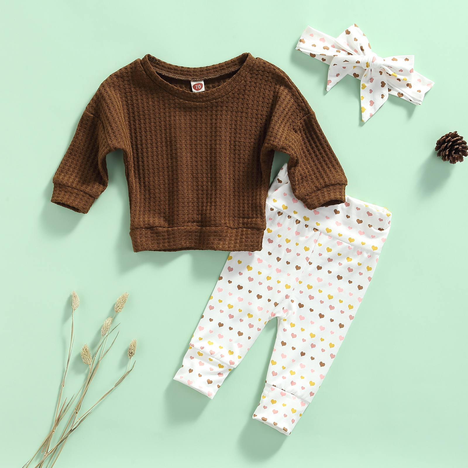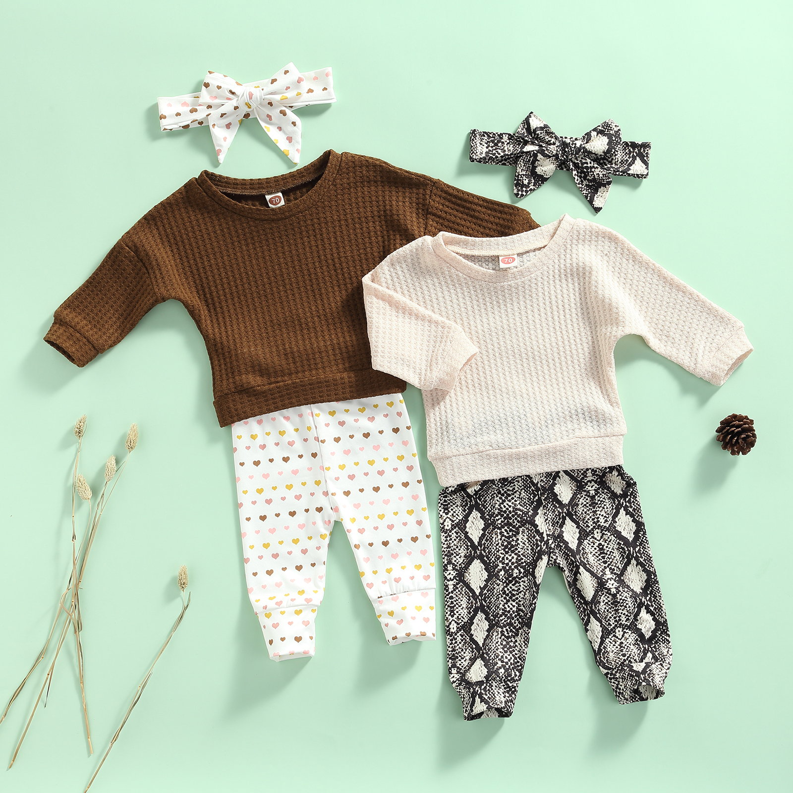 Таблица размеров: (см/дюйм)Размер; Длина топа; Обхват груди; Длина брюк; Рекомендуемый возраст70 31/12.20 58/22.83 37/14.57 0-6 месяцев80 33/12.99 60/23.62 39/15.35 6-12 месяцев90 35/13.78 62/24.41 41/16.14 12-18 месяцев100 37/14.57 64/25.20 43/16.93 18-24 месяцев110 39/15.35 66/25.98 45/17.72 От 2 до 3 летПримечание:1. Все размеры измеряются вручную, могут быть отклонения на 2-3 см;2. Из-за разницы между различными мониторами изображение может не отражать фактический цвет изделия. Спасибо за понимание!Содержимое посылка1 х топы с длинными рукавами для маленьких девочекБрюки с принтом-1 шт.Головной убор-1 шт.