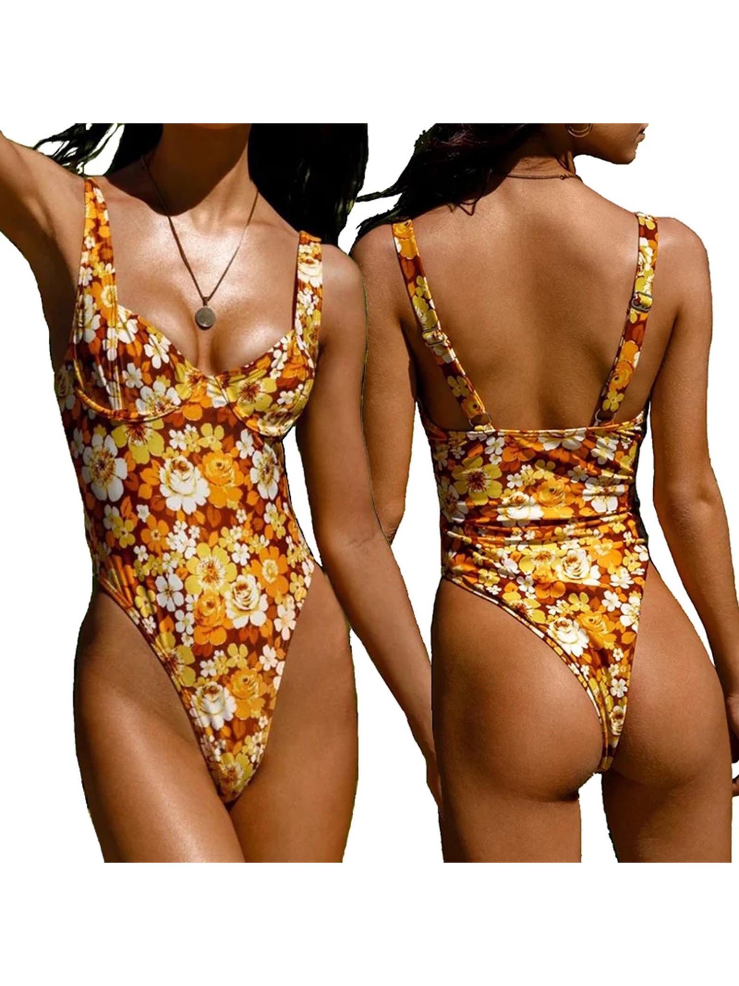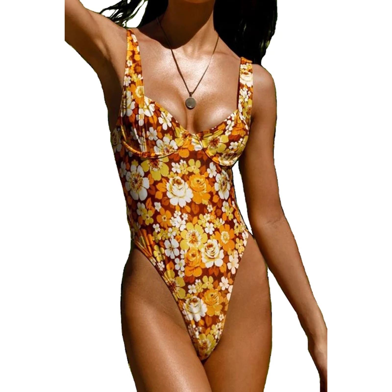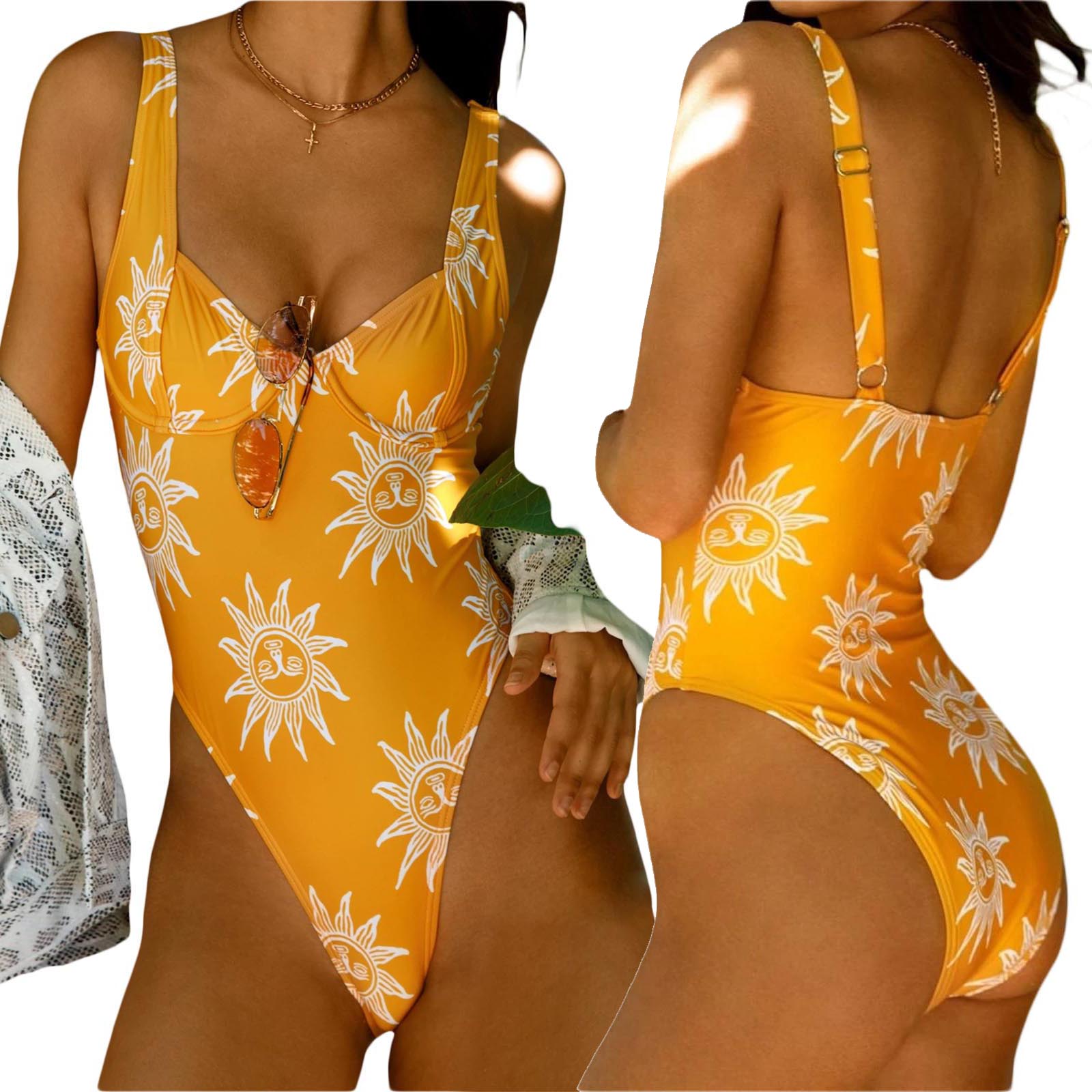 Women Summer Swimsuit, Floral/Sun Print Widen Straps Low-Cut Sleeveless Backless Padded Swimwear