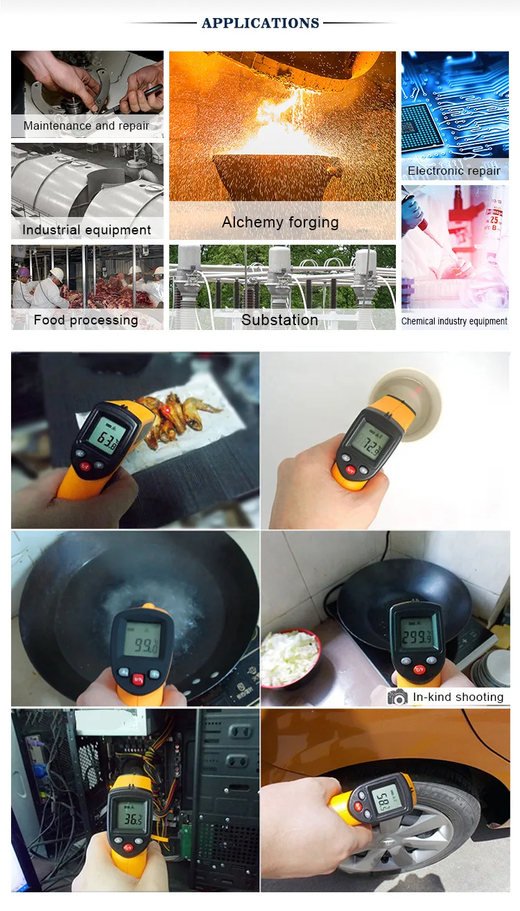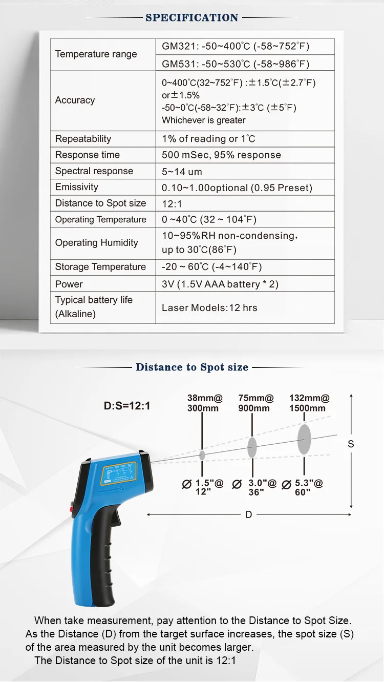 • Лазерная ИК-указка для точного прицеливания • Простое управление одной рукой • ЖК-дисплей со спинкой светильник • Переключатель ВКЛ/ВЫКЛ • Индикация низкого заряда батареи • Светодиодный светильник для работы при плохом освещении • Преобразование единицы измерения температуры C /F (по Цельсию/по Фаренгейту) • Автоматическое выключение в течение 7 секунд без каких-либо действий • Удержание дисплея, функция сканирования Характеристики: • Диапазон измерения: -50 °C ~ 400 °C ( -58 °F ~ 716 °F) • Точность: -50 °C ~ 0 °C (± 3 °C), 0 °C ~ 400 °C (± 1.5%) • Повторяемость: 1 °C или 1% чтения • Разрешение: 0,1 °C или 0,1 °F • Время отклика: 500 мс, 95% ответ • Излучение: 0,95 Предустановленный • Расстояние до точки рациона: 12:1 • Спектральная Характеристика: 8 ~ 14 мкм • Температура хранения: -20 °C ~ 60 °C (-4 °F ~ 140 °F) • Рабочая температура: 0 °C ~ 40 °C (32 °F ~ 104 °F) • Рабочая влажность: 10-95% относительной влажности без конденсации, до 30 °C (86 °F) • 2 х ААА 1,5 V батарея (не входит в комплект) Упаковочный лист: 1 * термометр GM320
