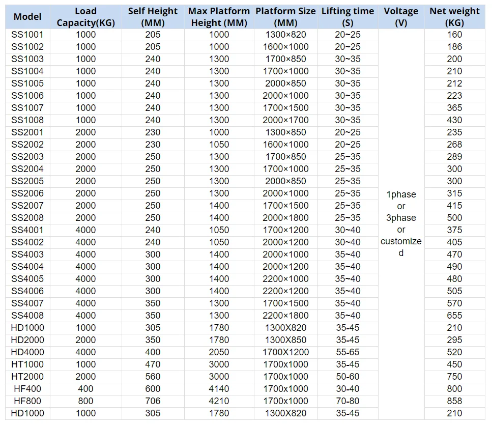 Sagafirst брендовые ножничные подъемные столыВысококачественные электронные гидравлические ножничные подъемники до американского стандарта ANSI/ASME и европейского стандарта EN1570. Стандартный типов моделей с емкостями нагрузки от 1000 кг до 4000 кг, и подъема высоты до 4 м. Мы также принимаем Индивидуальные Размеры платформы и высоту подъема.