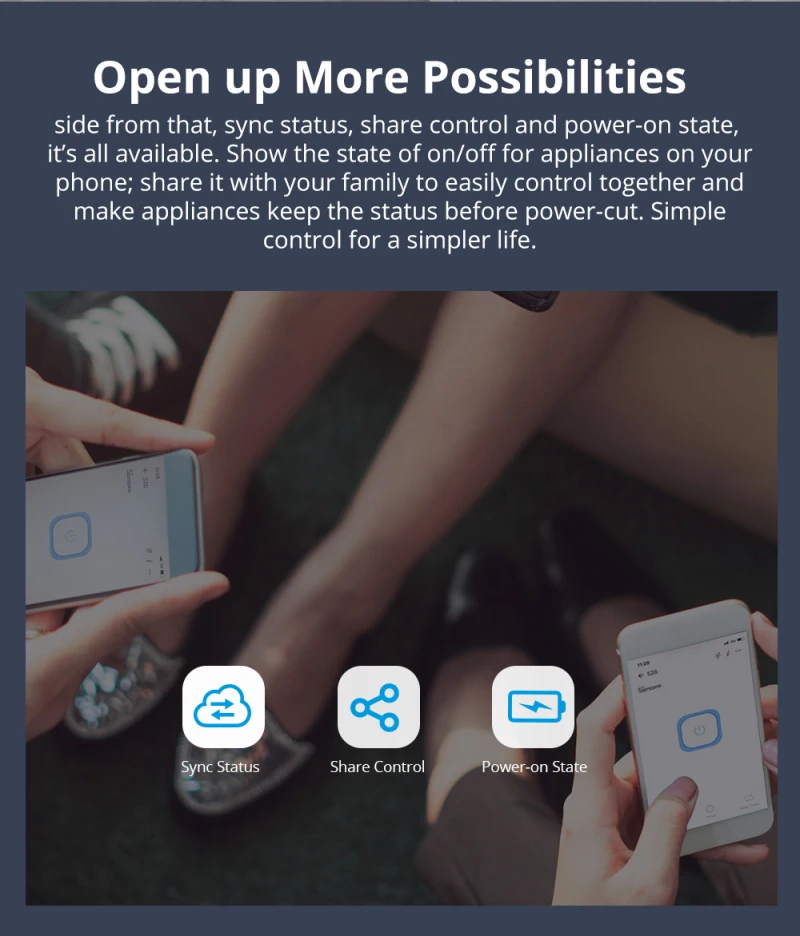 Вы можете включить/выключить любое подключенное устройство либо в приложении eWeLink, либо нажав кнопку ручного управления на розетке Wi-Fi.
