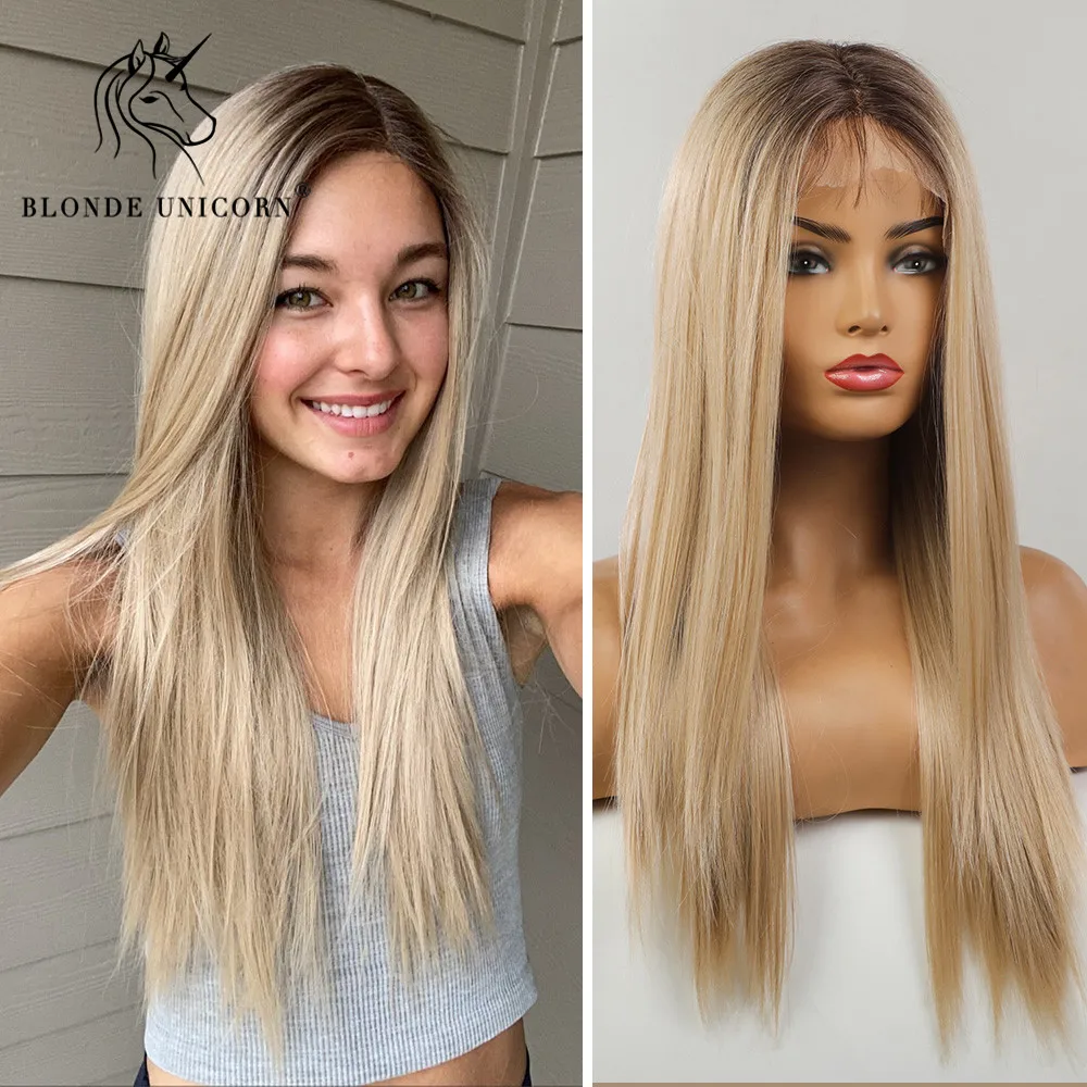 Блонд Единорог длинный Синтетический прямой Омбре светильник блонд Платина Кружева передние парики для женщин Косплей высокая плотность волос термостойкие