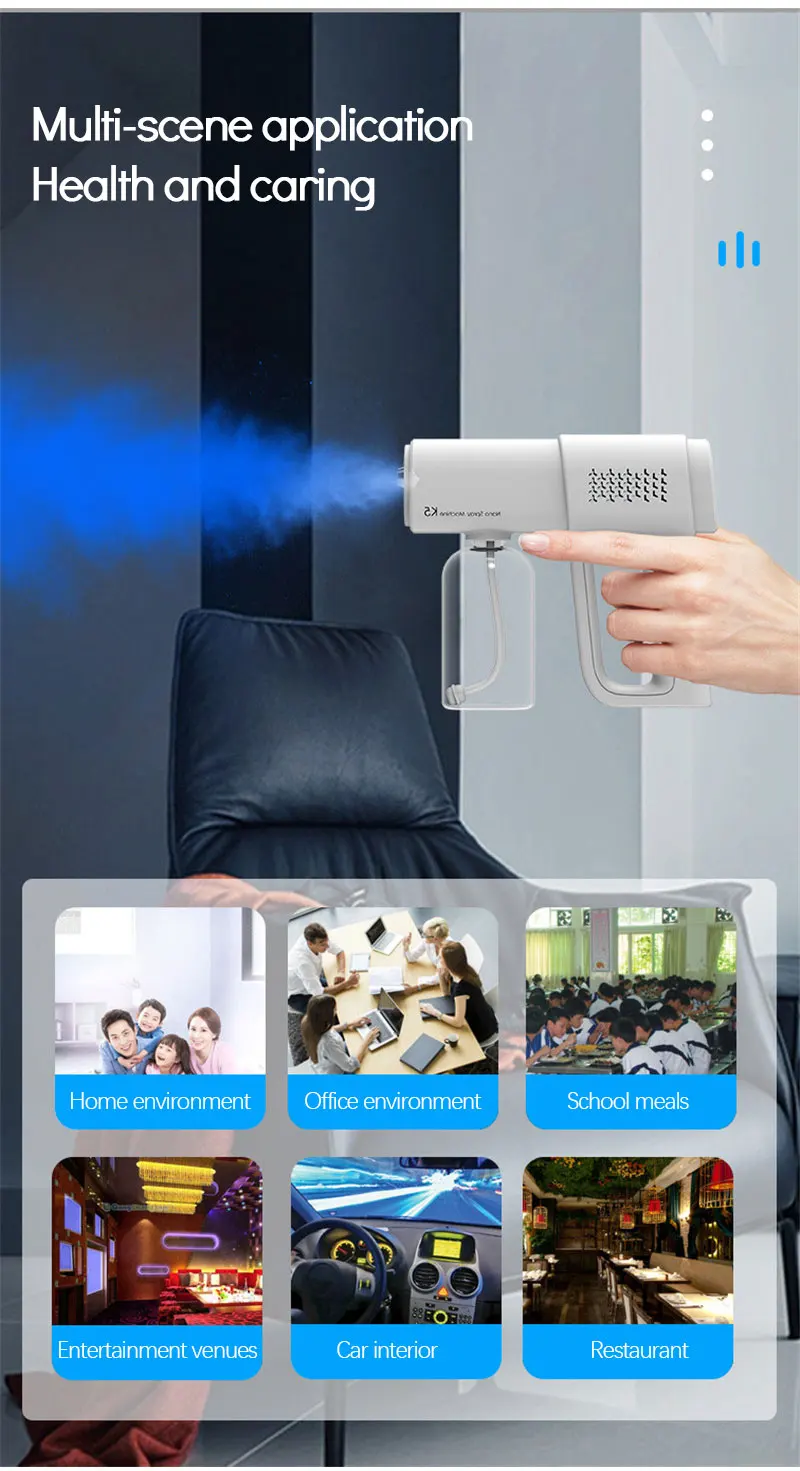 В дополнение к повседневной санитарно-гигиенической и дезинфекции, он также может заменить внутренние увлажнители, ароматерапевтические машины, пополняющие воду, устройства для полива и т. д.