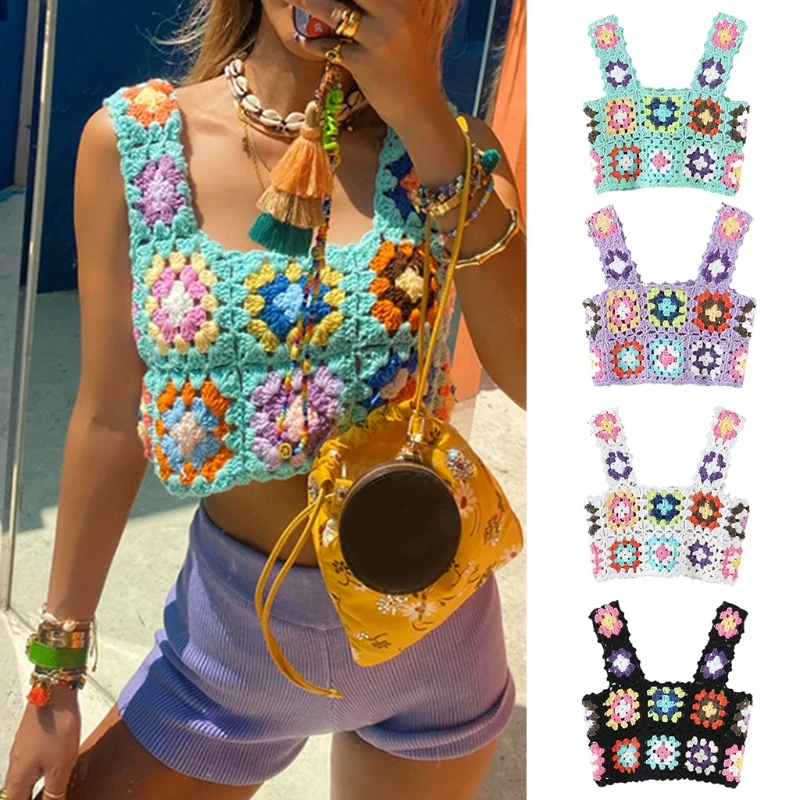 Женский летний Вязаный топ на бретелях, разноцветный цветочный клетчатый вязаный жилет, сексуальный тонкий пляжный укороченный топ без рукавов с квадратным вырезом