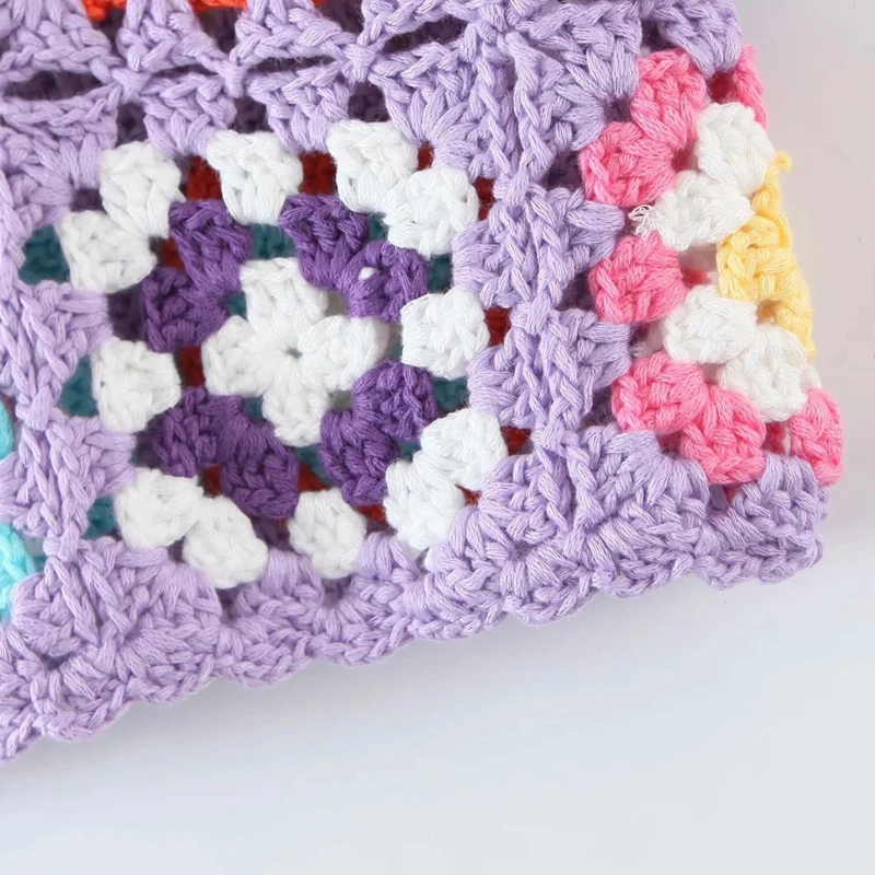 Богемский стиль, ажурный вязаный мини-жилет, разноцветный цветочный и клетчатый узор.