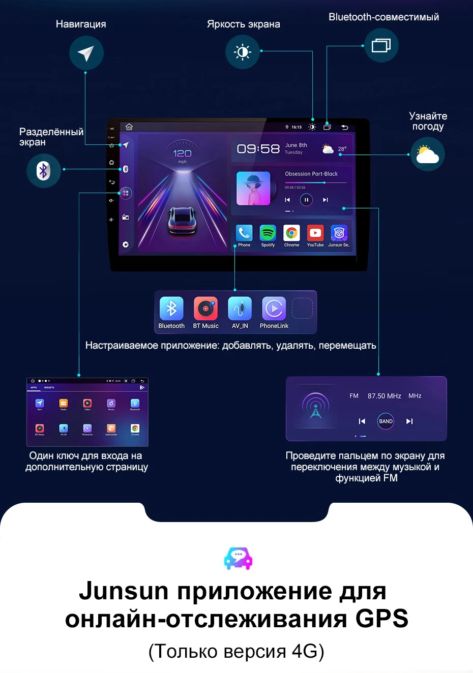 Устройство оснащено Навигатором, воспроизведением музыки, функцией помощи в парковке и т. Д. Однако для подключения радио к Интернету вам нужно будет использовать смартфон в качестве модема. Поэтому для тех владельцев автомобилей, которые активно используют Интернет во время путешествий, мы рекомендуем приобрести устройство с 4G. Так как если телефон постоянно находится в режиме модема, он быстро разрядится.