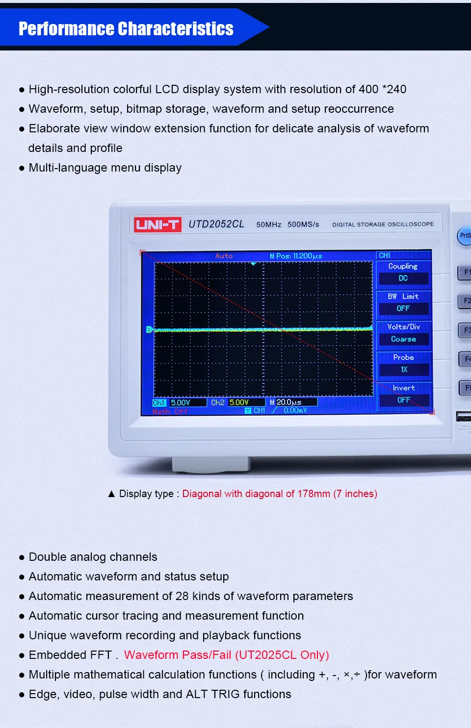 UNI-T UTD2025CL UTD2052CL цифровые осциллографы запись и воспроизведение 7 дюймов широкий экран ЖК-дисплеи