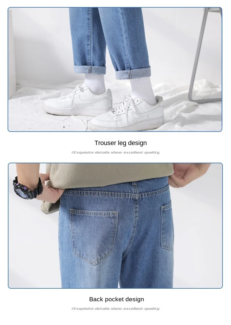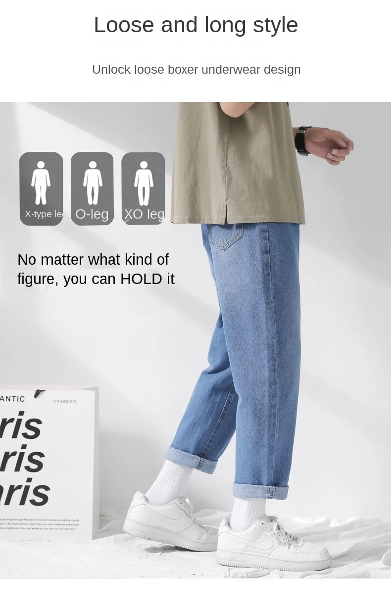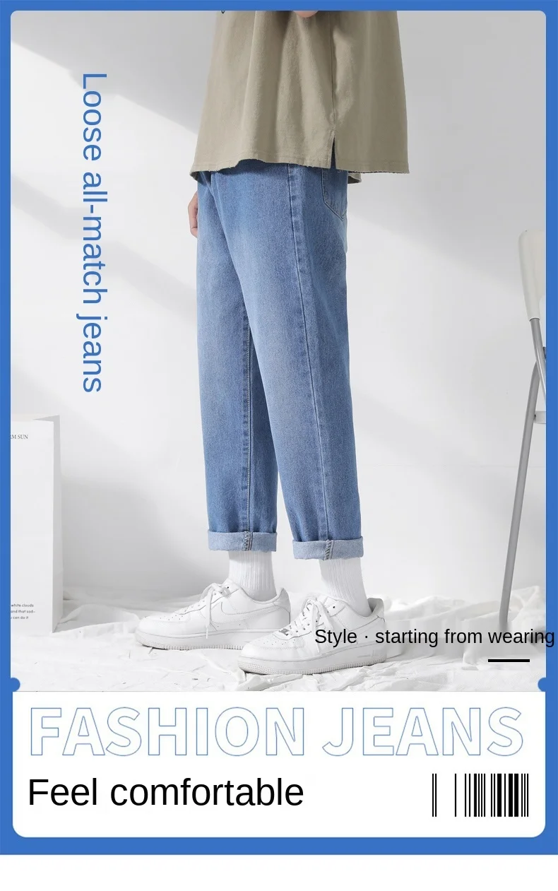 Джинсы мужские свободного покроя однотонные Модные шаровары средней длины на