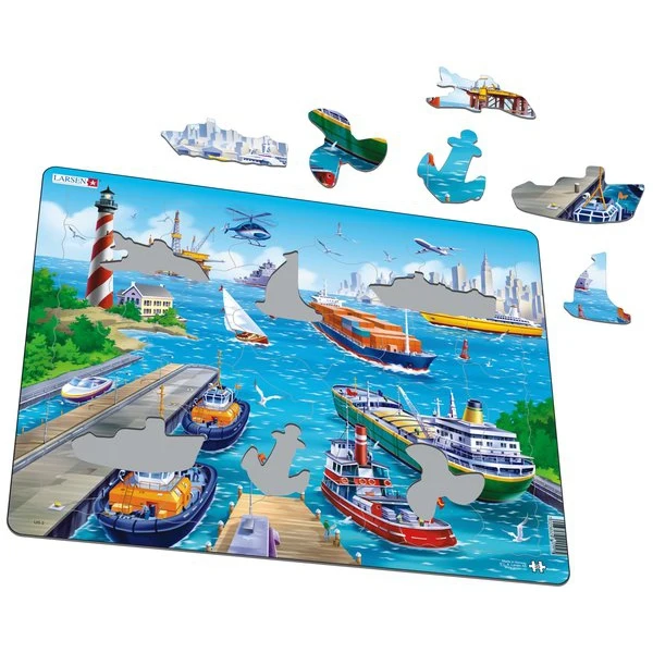 Эти пазлы представляют собой красочное и детальное изображение порта, со всеми его составляющими: бирюзовое море, пирс, маяк. На заднем плане - побережье с небоскребами. У пристани и в открытом море огромное разнообразие парусников, яхт, барж, кораблей. Малыш может начать сборку с одного пазла, это проще. В дальнейшем задачу можно усложнить, перемешав детали обоих пазлов и предложив ребенку правильно собрать оба пазла одновременно. Многообразие форм и разные размеры деталей пазла развивают мелкую моторику пальцев, дают представление о разнообразии размеров и форм предметов. Занятия по сборке пазла развивают образное и логическое мышление, пространственное воображение, память, внимание, координацию движений. В наборе: 36 элементов пазла. Размер собранного поля: 36,5х28,5 см.