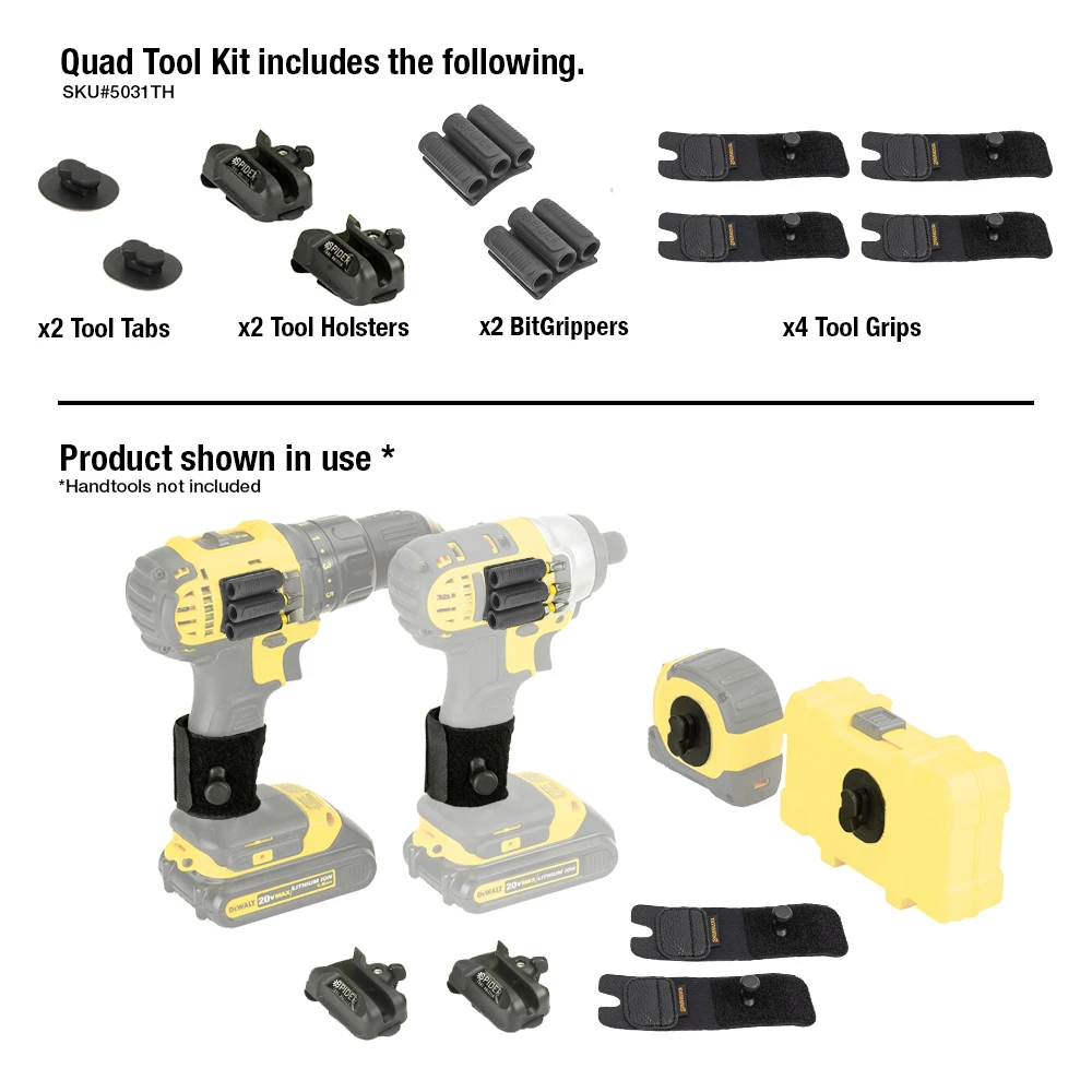 Двойной набор инструментов может оснастить два электроинструмента, которые будут использоваться с пауком чехол для инструментов. Чехол для инструментов крепится на любой ремень и имеет самоблокирующийся дизайн с быстрым выпуском. Рукоятки инструментов работают с любым ручным электроинструментом, включая ударные драйверы, сверла, ответные пилы, гидравлические гвоздики и т. Д. Битгриппер позволяет быстро, легко получить доступ для 3-6 бит драйвера прямо на стороне вашего ударного водителя или сверла. Включает в себя один чехол для инструментов, две рукоятки инструментов и две кусачки.