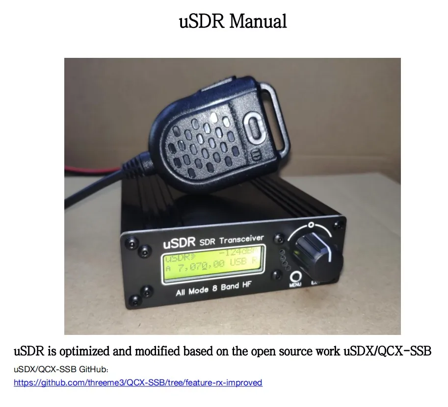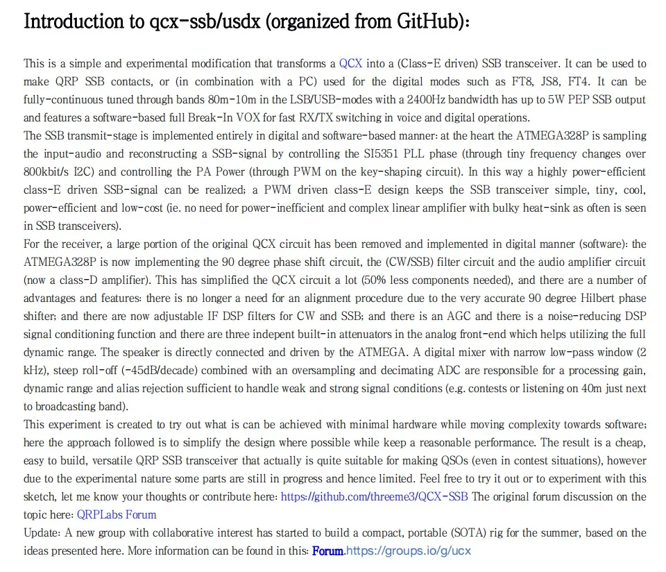 Он оптимизирован отUSDX QCX-SSBАппаратное обеспечение с открытым исходным кодом. Мощное программное обеспечение поддерживает использование меньшего количества аппаратных средств для завершения SW трансивера и поддерживает режим SSB (качество приема очень хорошее, качество передачи немного хуже). Кроме того, разработчик также разработали для него режим AM/FM, но AM/FM определяется как функция подарка. Не ожидайте, что AM/FM слишком высокий.