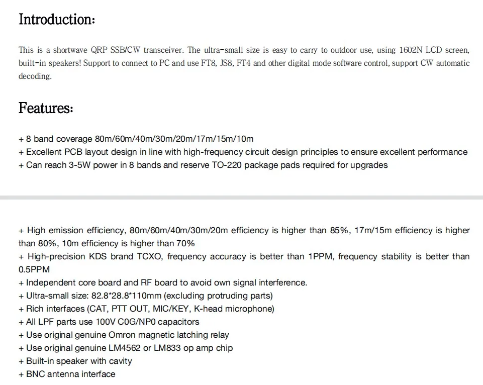 Оборудование, проданное на этот раз, является аппаратным средством после 3 итераций. Все известные дефекты были изменены, но я надеюсь, что он сохранит оригинальный дизайн как можно больше, чтобы Любители могли запросить больше информации на вышеуказанном веб-сайте, чтобы облегчить DIY или шлифовку на более позднем этапе. Аппаратные показатели этих продаж соответствуют или превышают оригинальный дизайн. Компоненты являются высококачественными компонентами, приобретенными Lichuang mall, PLL принимает 0.5ppm TCXO температурный Компенсированный кристаллический осциллятор, LPF часть принимает 100V np0 / c0g конденсатор, импортированное порошковое магнитное кольцо, И реле-магнитное удерживающее реле Omron.