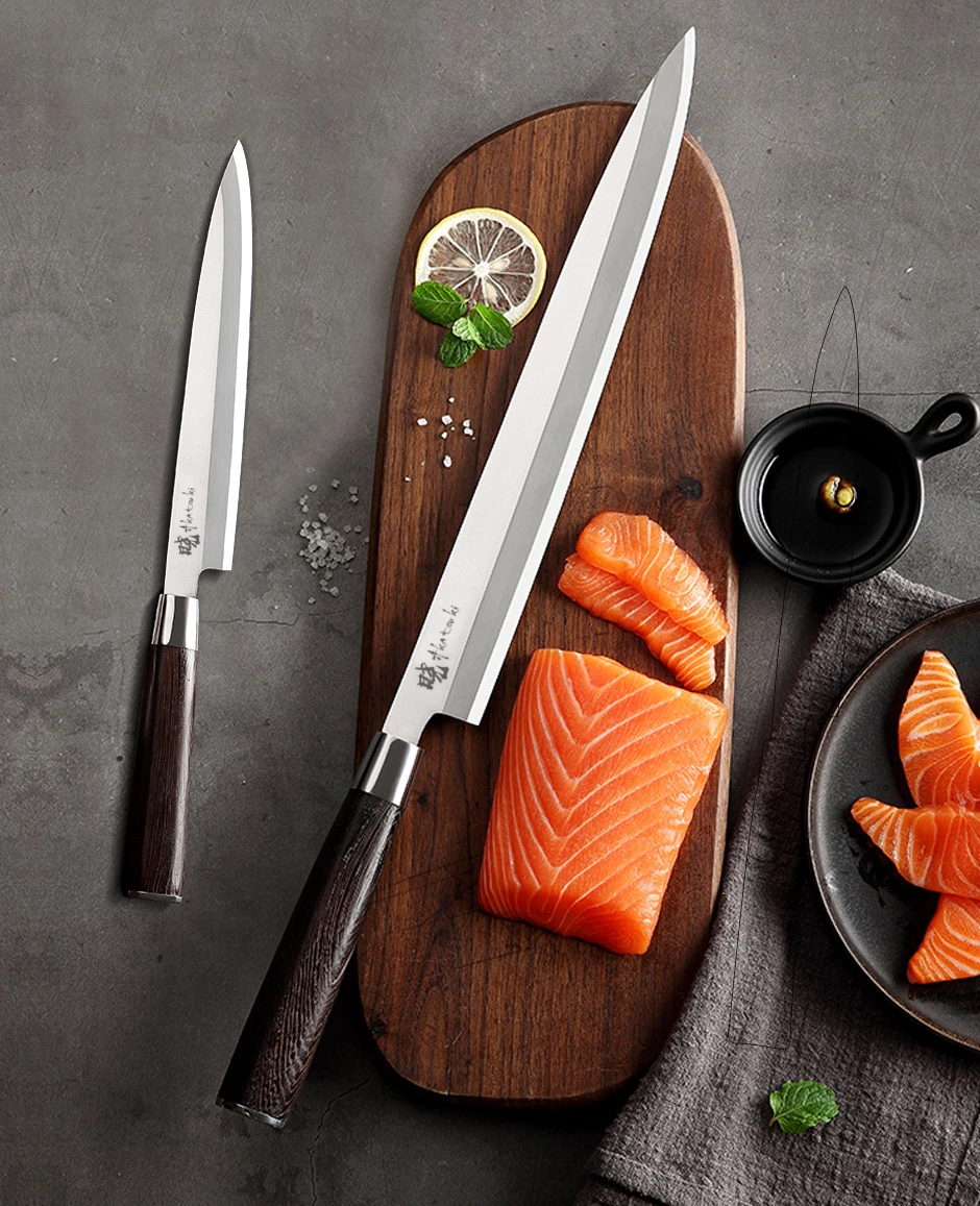 1..Японский стиль нож янагибаИспользуется для нарезки ультратонких ломтиков для таких блюд, как суши и сашими.